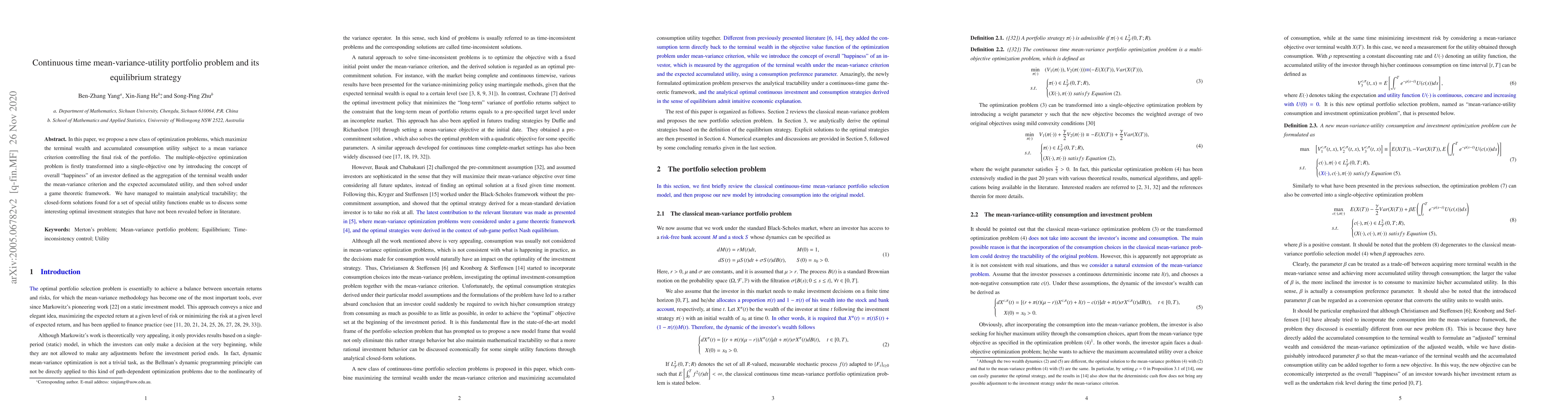 In this paper, we propose a new class of optimization problems, which maximize the terminal wealth and accumulated consumption utility subject to a mean variance criterion controlling the final risk of the portfolio. The multiple-objective optimization problem is firstly transformed into a single-objective one by introducing the concept of overall "happiness" of an investor defined as the aggregation of the terminal wealth under the mean-variance criterion and the expected accumulated utility, and then solved under a game theoretic framework. We have managed to maintain analytical tractability; the closed-form solutions found for a set of special utility functions enable us to discuss some interesting optimal investment strategies that have not been revealed before in literature.