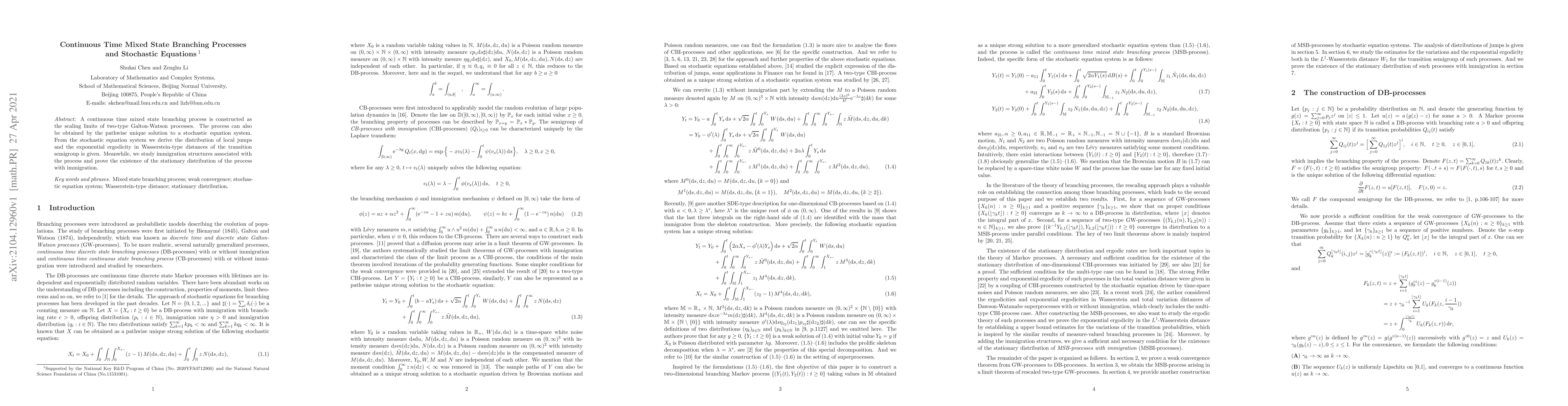 This paper constructs a continuous time mixed state branching process as the scaling limit of two-type Galton-Watson processes and identifies it as the unique solution to a stochastic equation system. It also explores the process's immigration structures and proves the existence of its stationary distribution.