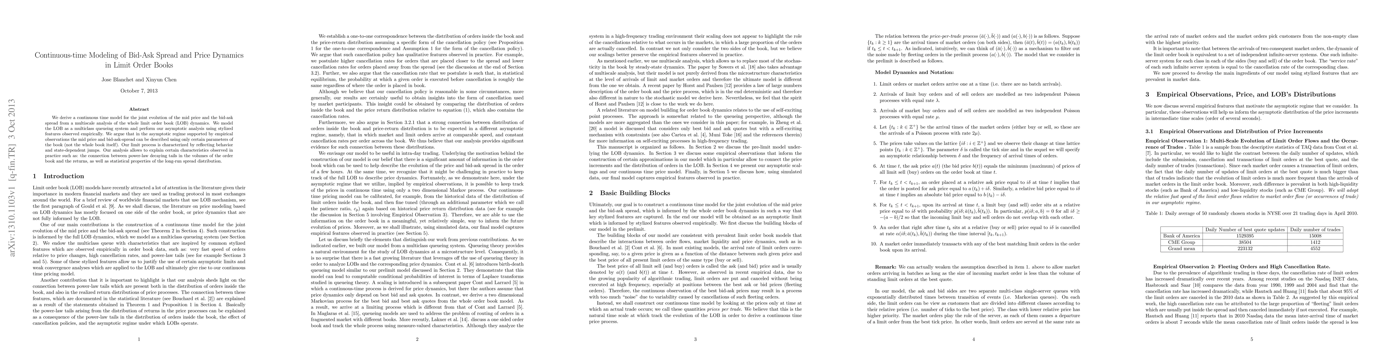 This paper develops a continuous-time model for the joint dynamics of the mid price and bid-ask spread in limit order books, treating the book as a multiclass queueing system. The model explains empirical observations like the power-law decay in order book volumes and return distributions, and characterizes the limit process with reflecting behavior and state-dependent jumps.