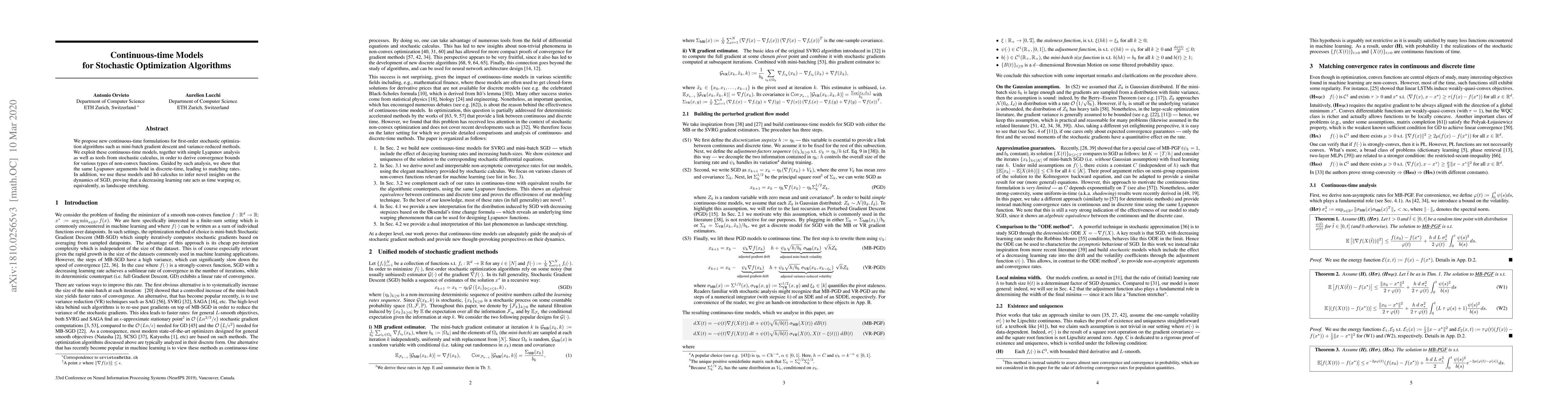 This paper introduces continuous-time models for first-order stochastic optimization algorithms, using Lyapunov analysis and stochastic calculus to derive convergence bounds for non-convex functions. It also demonstrates that these continuous-time insights match discrete-time rates and reveals that a decreasing learning rate functions as time warping or landscape stretching.