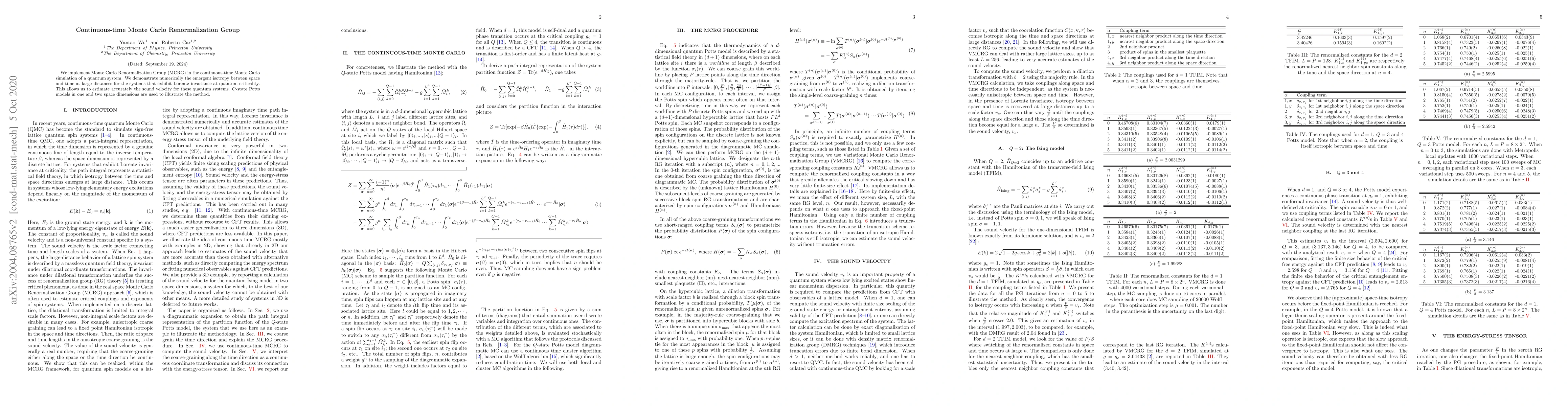 This paper implements continuous-time Monte Carlo Renormalization Group (MCRG) to simulate quantum systems, demonstrating emergent isotropy between space and time at large distances in Lorentz-invariant quantum critical systems and accurately estimating the sound velocity using $Q$-state Potts models.