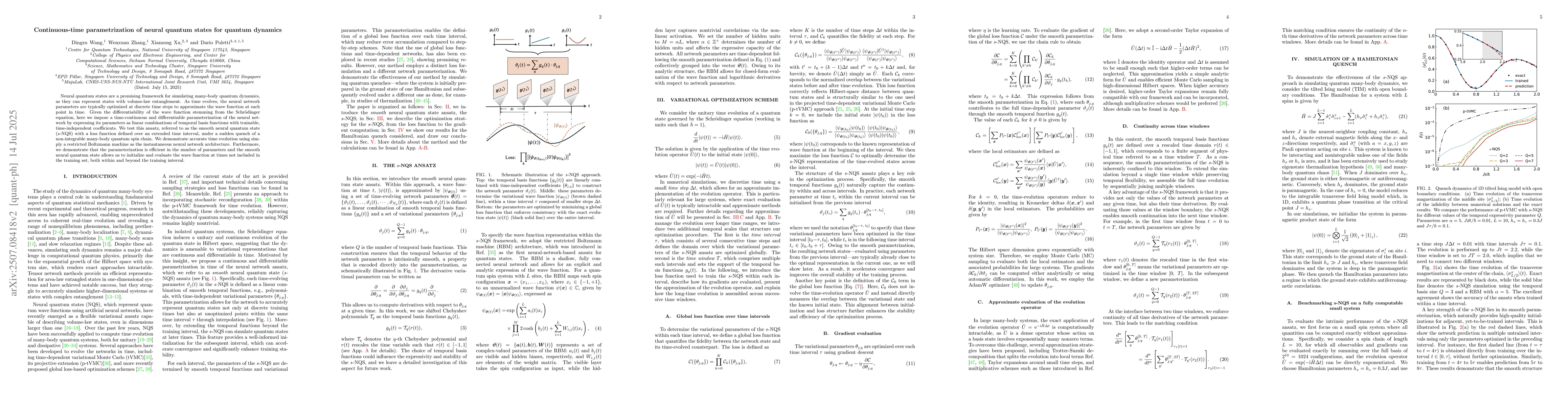 Neural quantum states are a promising framework for simulating many-body quantum dynamics, as they can represent states with volume-law entanglement. As time evolves, the neural network parameters are typically optimized at discrete time steps to approximate the wave function at each point in time. Given the differentiability of the wave function stemming from the Schr\"odinger equation, here we impose a time-continuous and differentiable parameterization of the neural network by expressing its parameters as linear combinations of temporal basis functions with trainable, time-independent coefficients. We test this ansatz, referred to as the smooth neural quantum state ($s$-NQS) with a loss function defined over an extended time interval, under a sudden quench of a non-integrable many-body quantum spin chain. We demonstrate accurate time evolution using simply a restricted Boltzmann machine as the instantaneous neural network architecture. Furthermore, we demonstrate that the parameterization is efficient in the number of parameters and the smooth neural quantum state allows us to initialize and evaluate the wave function at times not included in the training set, both within and beyond the training interval.