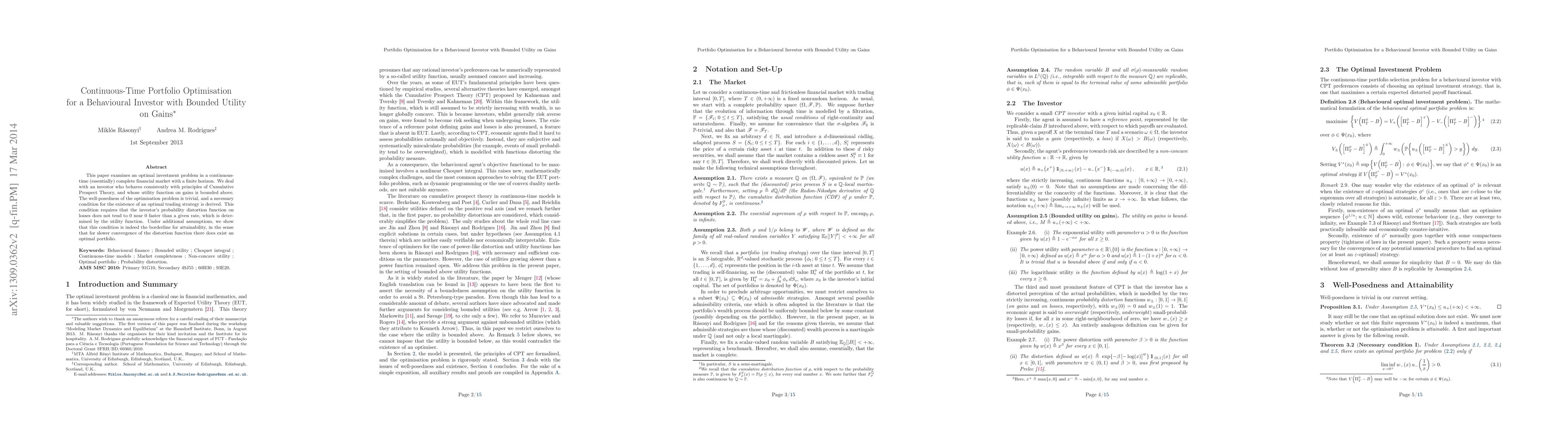 This paper investigates how a bounded utility function affects investment decisions in continuous-time portfolio optimization for investors with a behavioral bias. It finds that the rate at which an investor's probability distortion function on losses converges is crucial for optimal trading strategy existence.