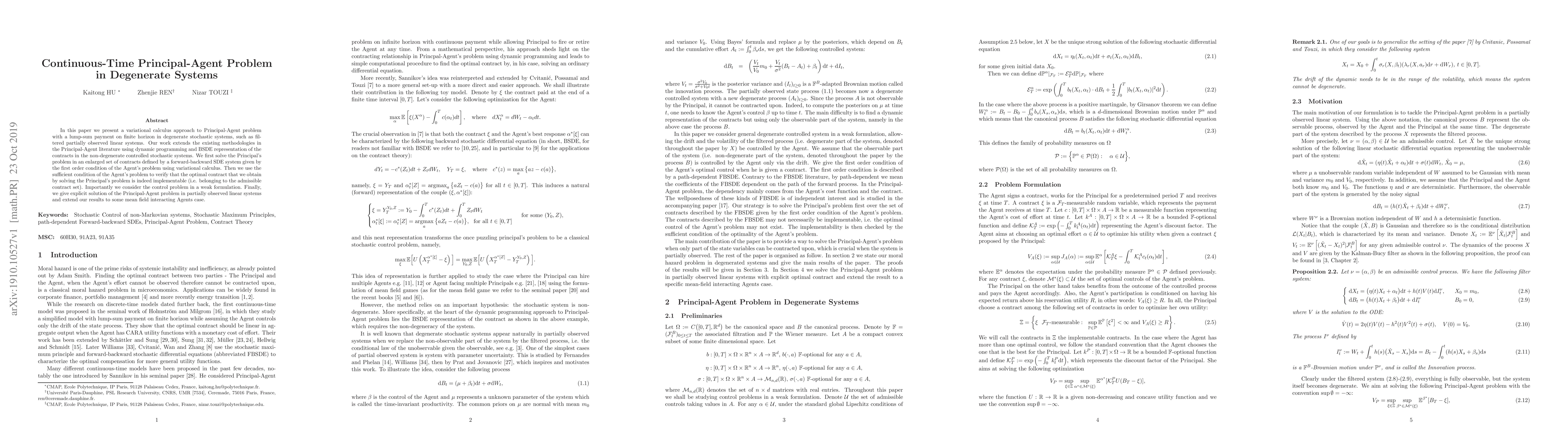 This paper employs variational calculus to solve the continuous-time Principal-Agent problem in degenerate stochastic systems, specifically filtered partially observed linear systems. The authors extend existing methodologies by solving the Principal's problem using a forward-backward SDE system and verifying the implementability of the optimal contract through the Agent's problem.