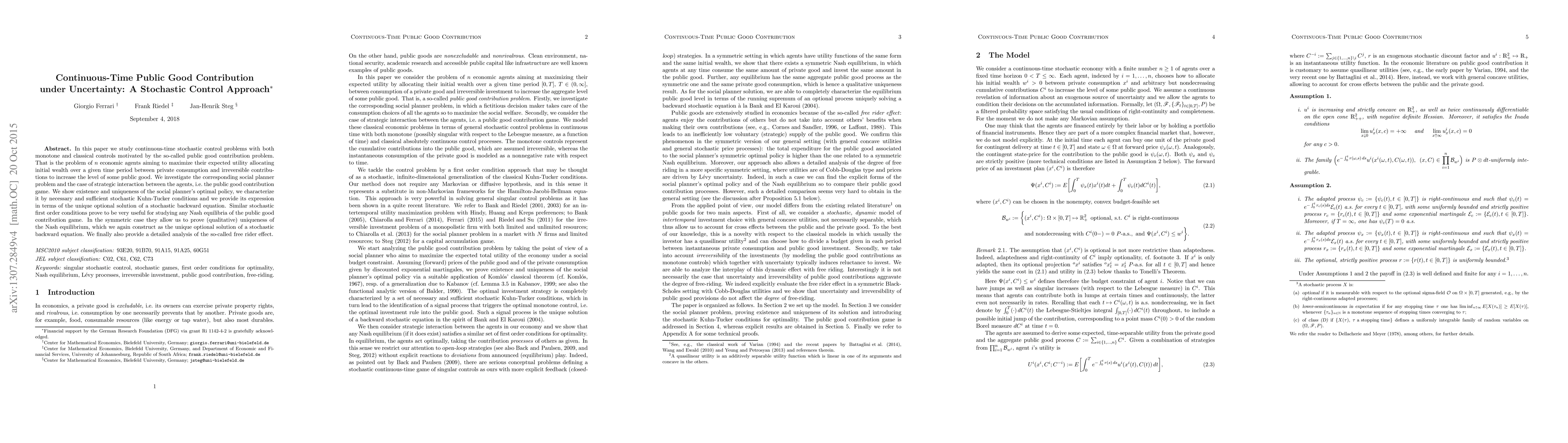 This paper studies how individuals contribute to a public good over time while considering uncertainty, using stochastic control approaches to find optimal policies and analyze Nash equilibria.