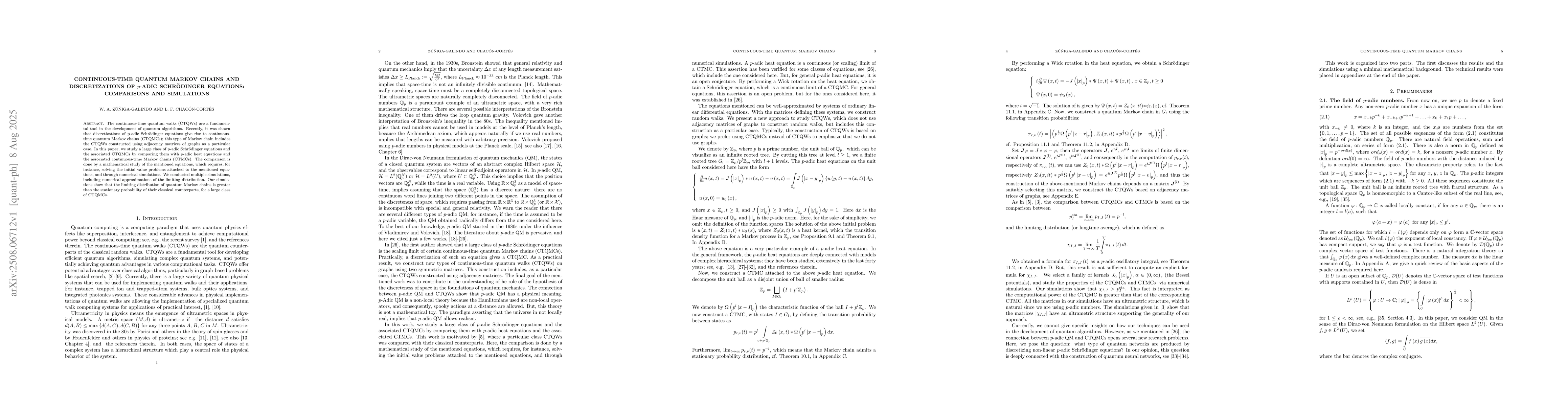 The continuous-time quantum walks (CTQWs) are a fundamental tool in the development of quantum algorithms. Recently, it was shown that discretizations of p-adic Schr\"odinger equations give rise to continuous-time quantum Markov chains (CTQMCs); this type of Markov chain includes the CTQWs constructed using adjacency matrices of graphs as a particular case. In this paper, we study a large class of p-adic Schr\"odinger equations and the associated CTQMCs by comparing them with p-adic heat equations and the associated continuous-time Markov chains (CTMCs). The comparison is done by a mathematical study of the mentioned equations, which requires, for instance, solving the initial value problems attached to the mentioned equations, and through numerical simulations. We conducted multiple simulations, including numerical approximations of the limiting distribution. Our simulations show that the limiting distribution of quantum Markov chains is greater than the stationary probability of their classical counterparts, for a large class of CTQMCs.