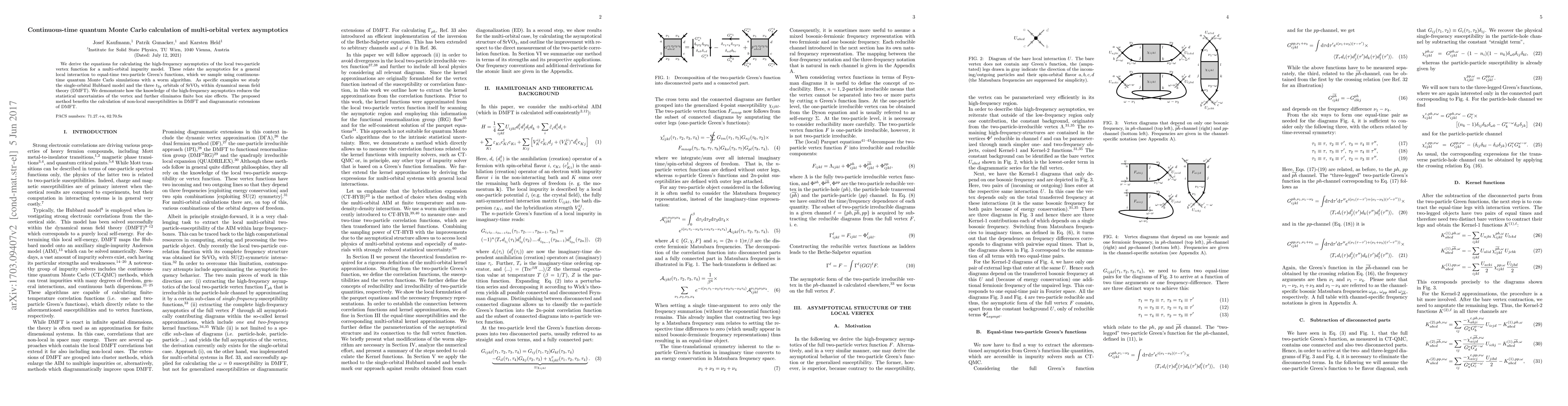 This paper develops equations for calculating the high-frequency asymptotics of the local two-particle vertex function in multi-orbital impurity models using continuous-time quantum Monte Carlo simulations. The method is applied to the Hubbard model and SrVO$_3$'s $t_{2g}$ orbitals within DMFT, showing reduced statistical uncertainties and elimination of finite box size effects.