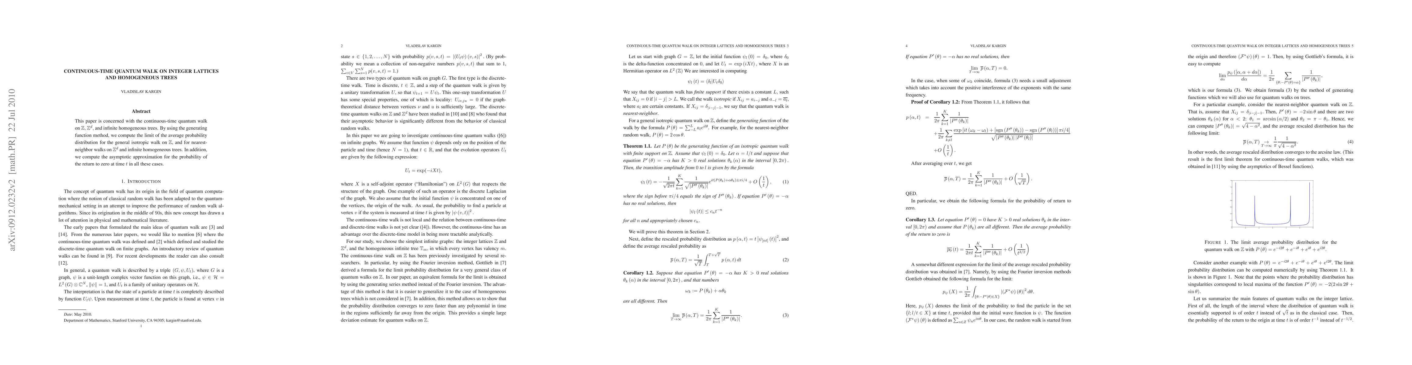 This paper investigates continuous-time quantum walks on integer lattices and infinite homogeneous trees, computing the limit of the average probability distribution and the asymptotic return probability to the origin using the generating function method.