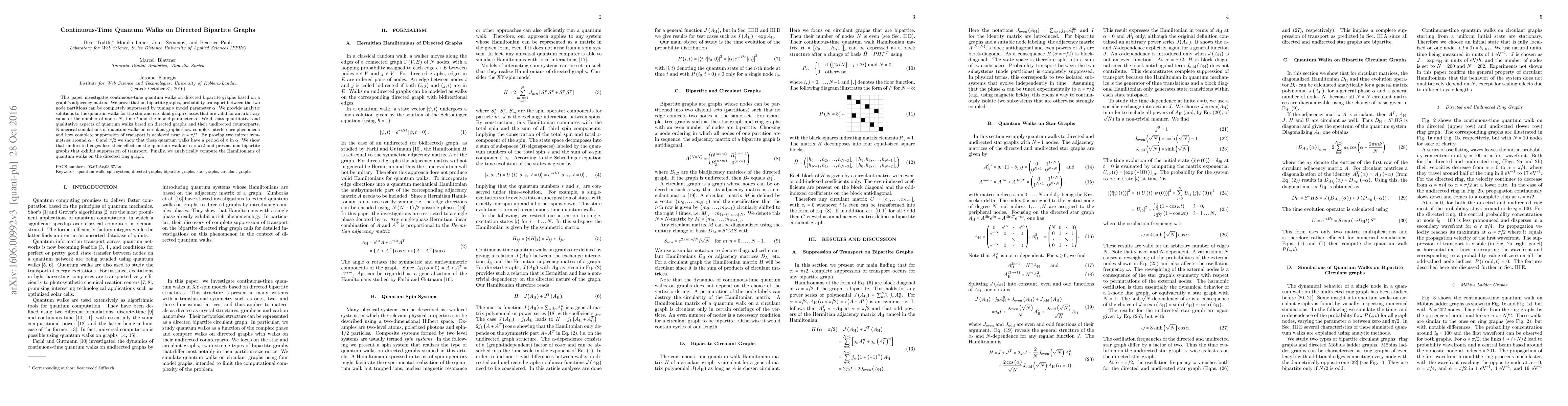 This paper explores continuous-time quantum walks on directed bipartite graphs, proving suppression of probability transport between partitions by adjusting parameter $\alpha$. It provides analytic solutions for star and circulant graphs, revealing complex interference and transport suppression near $\alpha=\pi/2$, and computes Hamiltonians for directed ring graphs.