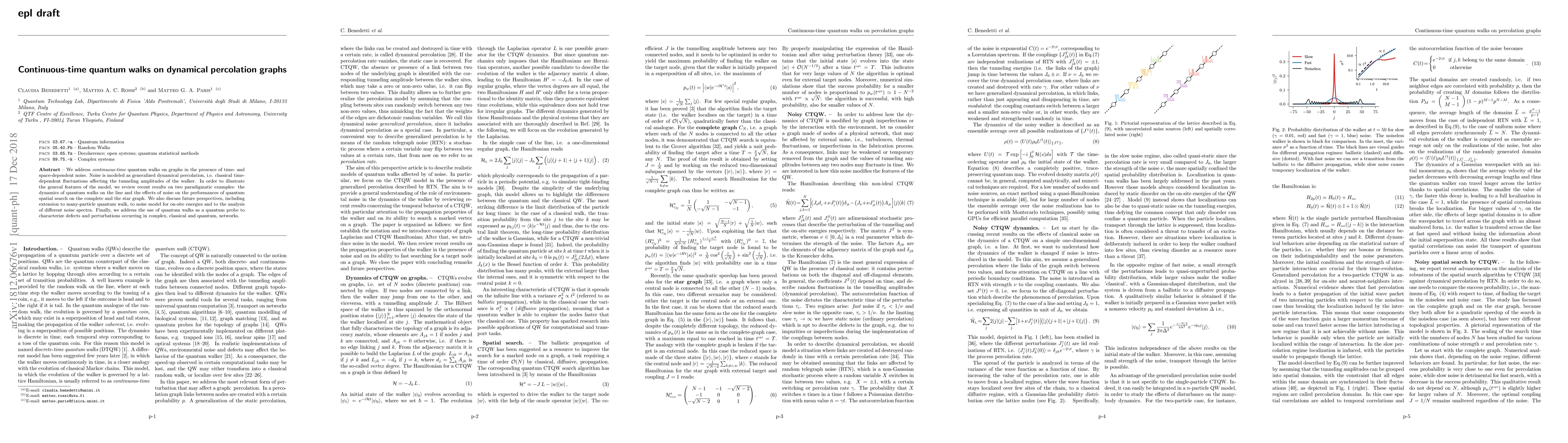 We address continuous-time quantum walks on graphs in the presence of time- and space-dependent noise. Noise is modeled as generalized dynamical percolation, i.e. classical time-dependent fluctuations affecting the tunneling amplitudes of the walker. In order to illustrate the general features of the model, we review recent results on two paradigmatic examples: the dynamics of quantum walks on the line and the effects of noise on the performances of quantum spatial search on the complete and the star graph. We also discuss future perspectives, including extension to many-particle quantum walk, to noise model for on-site energies and to the analysis of different noise spectra. Finally, we address the use of quantum walks as a quantum probe to characterize defects and perturbations occurring in complex, classical and quantum, networks.