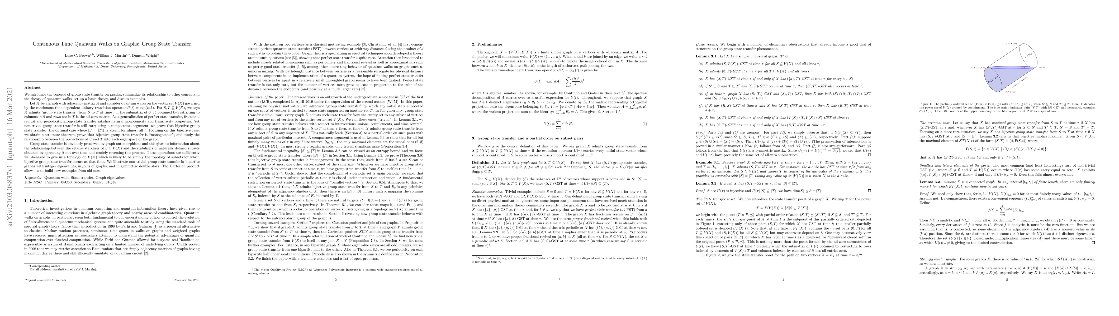 We introduce the concept of group state transfer on graphs, summarize its relationship to other concepts in the theory of quantum walks, set up a basic theory, and discuss examples. Let $X$ be a graph with adjacency matrix $A$ and consider quantum walks on the vertex set $V(X)$ governed by the continuous time-dependent unitary transition operator $U(t)= \exp(itA)$. For $S,T\subseteq V(X)$, we says $X$ admits "group state transfer" from $S$ to $T$ at time $\tau$ if the submatrix of $U(\tau)$ obtained by restricting to columns in $S$ and rows not in $T$ is the all-zero matrix. As a generalization of perfect state transfer, fractional revival and periodicity, group state transfer satisfies natural monotonicity and transitivity properties. Yet non-trivial group state transfer is still rare; using a compactness argument, we prove that bijective group state transfer (the optimal case where $|S|=|T|$) is absent for almost all $t$. Focusing on this bijective case, we obtain a structure theorem, prove that bijective group state transfer is "monogamous", and study the relationship between the projections of $S$ and $T$ into each eigenspace of the graph. Group state transfer is obviously preserved by graph automorphisms and this gives us information about the relationship between the setwise stabilizer of $S\subseteq V(X)$ and the stabilizers of naturally defined subsets obtained by spreading $S$ out over time and crudely reversing this process. These operations are sufficiently well-behaved to give us a topology on $V(X)$ which is likely to be simply the topology of subsets for which bijective group state transfer occurs at that time. We illustrate non-trivial group state transfer in bipartite graphs with integer eigenvalues, in joins of graphs, and in symmetric double stars. The Cartesian product allows us to build new examples from old ones.