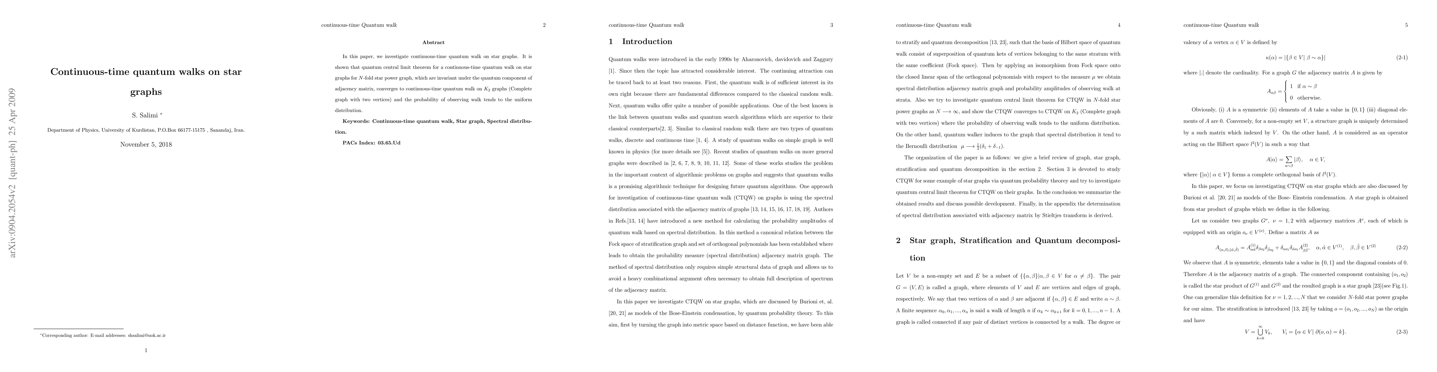 This paper explores continuous-time quantum walks on star graphs, demonstrating that they converge to a continuous-time quantum walk on $K_2$ graphs, with the probability distribution becoming uniform.