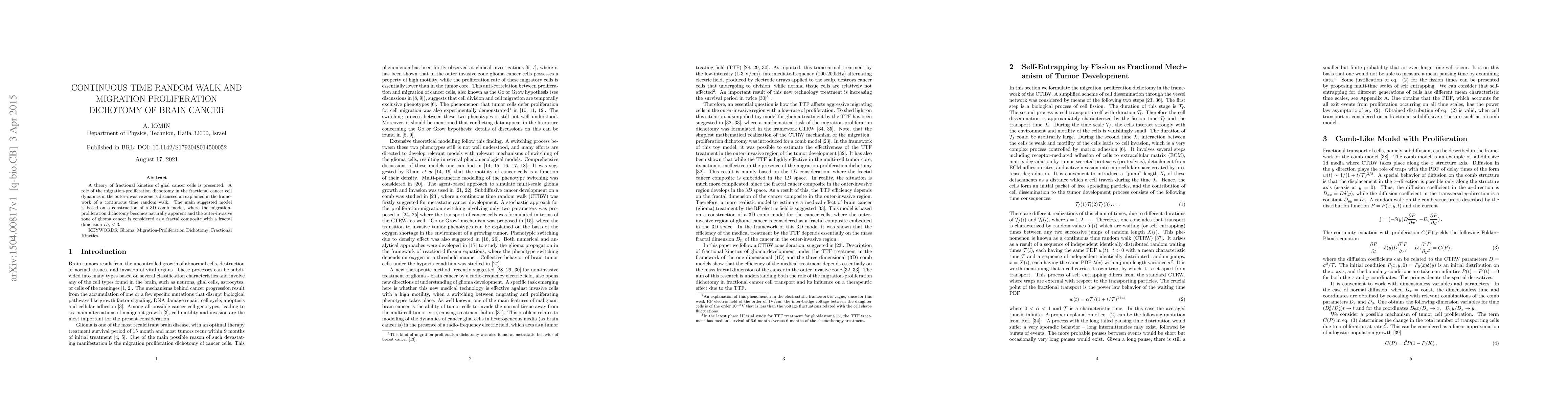 This paper proposes a fractional kinetics theory for glial cancer cells, emphasizing the migration-proliferation dichotomy in the outer-invasive zone's dynamics through a continuous time random walk. The model utilizes a 3D comb structure to illustrate this dichotomy and treats the outer-invasive zone as a fractal composite.