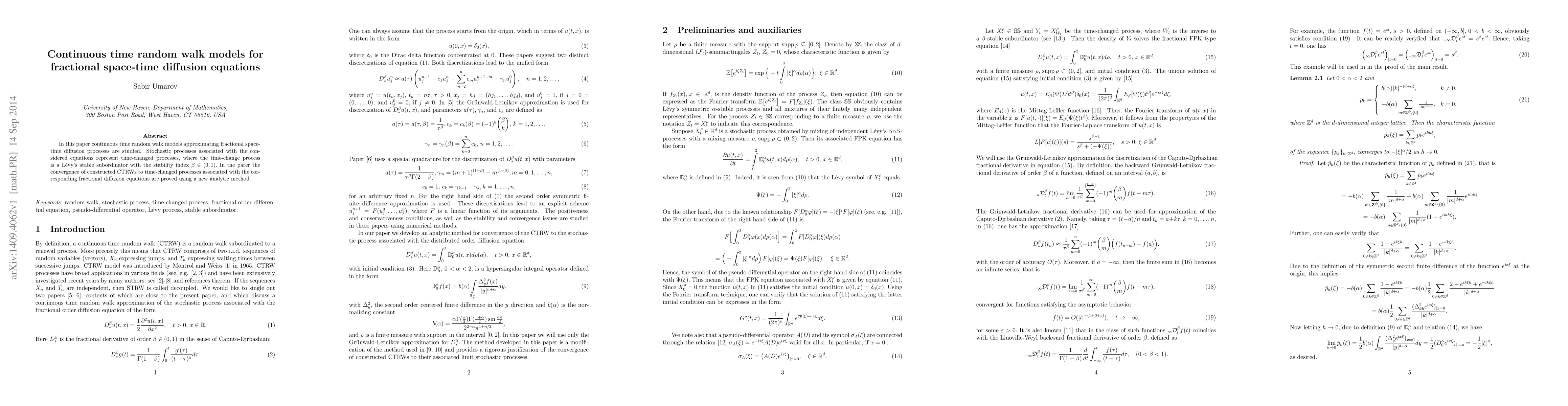 This paper explores continuous time random walk (CTRW) models approximating fractional space-time diffusion processes, proving their convergence to time-changed processes via a novel analytic method, where the time-change process is a Lévy's stable subordinator with a stability index $\beta \in (0,1)$.