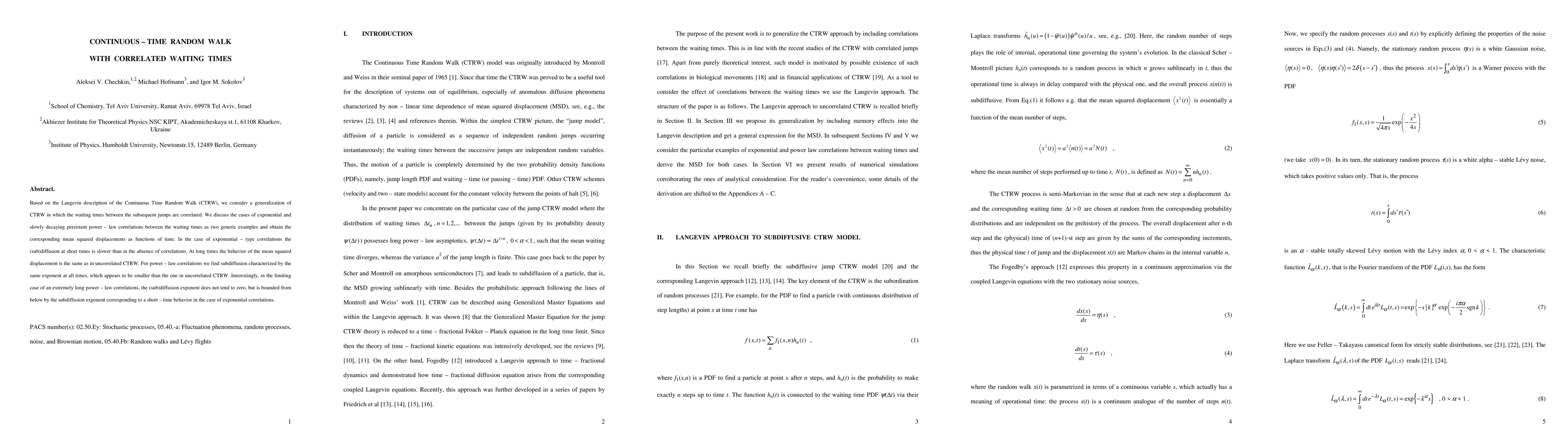 Based on the Langevin description of the Continuous Time Random Walk (CTRW), we consider a generalization of CTRW in which the waiting times between the subsequent jumps are correlated. We discuss the cases of exponential and slowly decaying persistent power-law correlations between the waiting times as two generic examples and obtain the corresponding mean squared displacements as functions of time. In the case of exponential-type correlations the (sub)diffusion at short times is slower than in the absence of correlations. At long times the behavior of the mean squared displacement is the same as in uncorrelated CTRW. For power-law correlations we find subdiffusion characterized by the same exponent at all times, which appears to be smaller than the one in uncorrelated CTRW. Interestingly, in the limiting case of an extremely long power-law correlations, the (sub)diffusion exponent does not tend to zero, but is bounded from below by the subdiffusion exponent corresponding to a short time behavior in the case of exponential correlations.