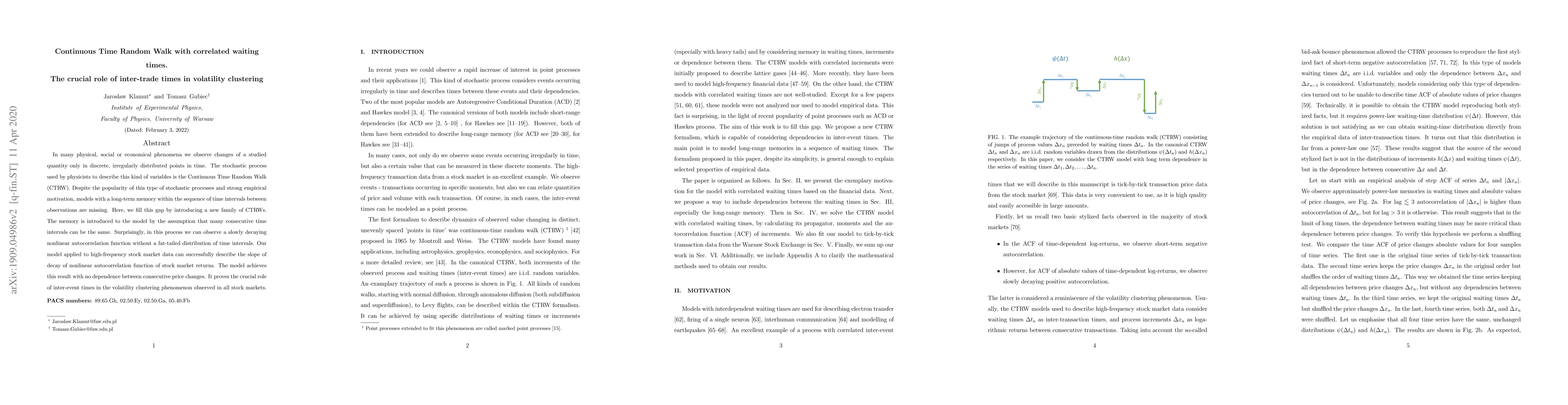 In many physical, social or economical phenomena we observe changes of a studied quantity only in discrete, irregularly distributed points in time. The stochastic process used by physicists to describe this kind of variables is the Continuous Time Random Walk (CTRW). Despite the popularity of this type of stochastic processes and strong empirical motivation, models with a long-term memory within the sequence of time intervals between observations are missing. Here, we fill this gap by introducing a new family of CTRWs. The memory is introduced to the model by the assumption that many consecutive time intervals can be the same. Surprisingly, in this process we can observe a slowly decaying nonlinear autocorrelation function without a fat-tailed distribution of time intervals. Our model applied to high-frequency stock market data can successfully describe the slope of decay of nonlinear autocorrelation function of stock market returns. The model achieves this result with no dependence between consecutive price changes. It proves the crucial role of inter-event times in the volatility clustering phenomenon observed in all stock markets.