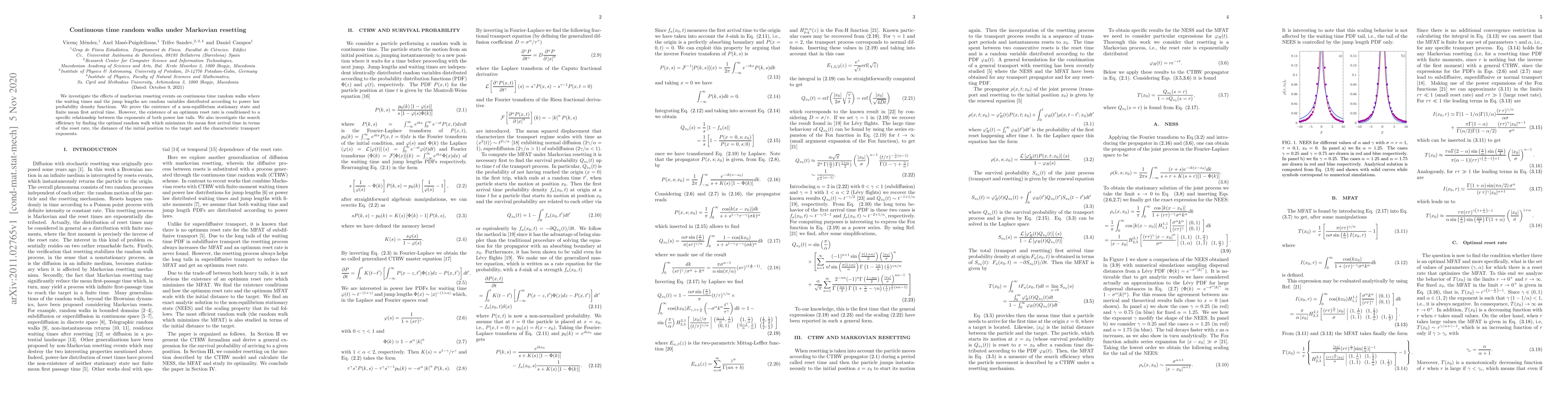 We investigate the effects of markovian resseting events on continuous time random walks where the waiting times and the jump lengths are random variables distributed according to power law probability density functions. We prove the existence of a non-equilibrium stationary state and finite mean first arrival time. However, the existence of an optimum reset rate is conditioned to a specific relationship between the exponents of both power law tails. We also investigate the search efficiency by finding the optimal random walk which minimizes the mean first arrival time in terms of the reset rate, the distance of the initial position to the target and the characteristic transport exponents.