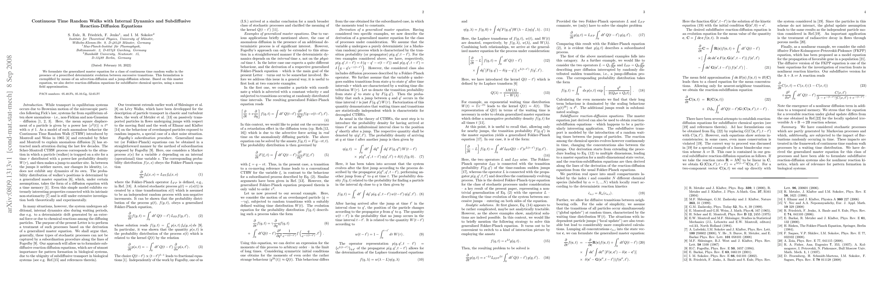 This paper formulates a generalized master equation for continuous time random walks with internal dynamics, exemplified through advection-diffusion and jump-diffusion schemes, and derives subdiffusive reaction-diffusion equations for chemical species using mean field approximation.
