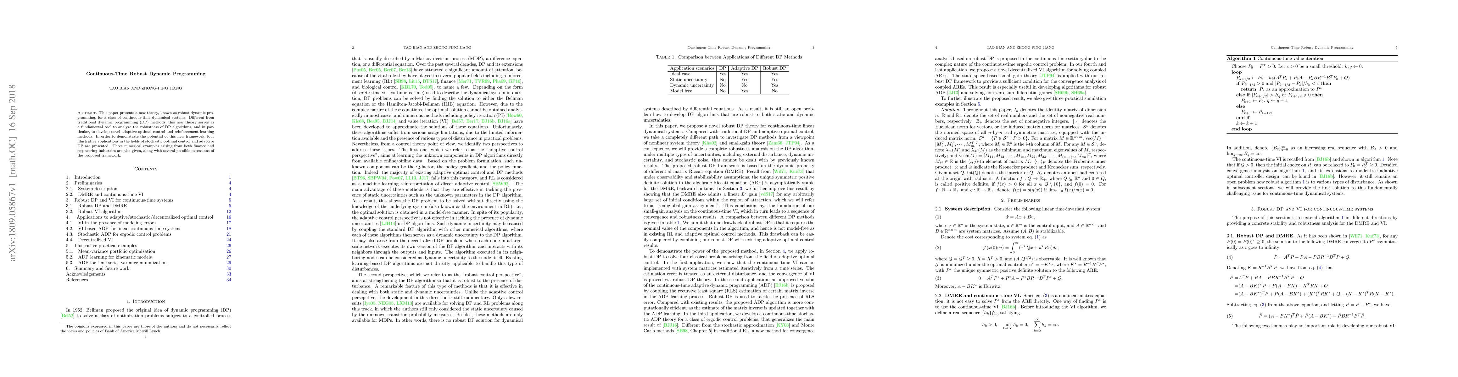 This paper presents a new theory, known as robust dynamic pro- gramming, for a class of continuous-time dynamical systems. Different from traditional dynamic programming (DP) methods, this new theory serves as a fundamental tool to analyze the robustness of DP algorithms, and in par- ticular, to develop novel adaptive optimal control and reinforcement learning methods. In order to demonstrate the potential of this new framework, four illustrative applications in the fields of stochastic optimal control and adaptive DP are presented. Three numerical examples arising from both finance and engineering industries are also given, along with several possible extensions of the proposed framework.
