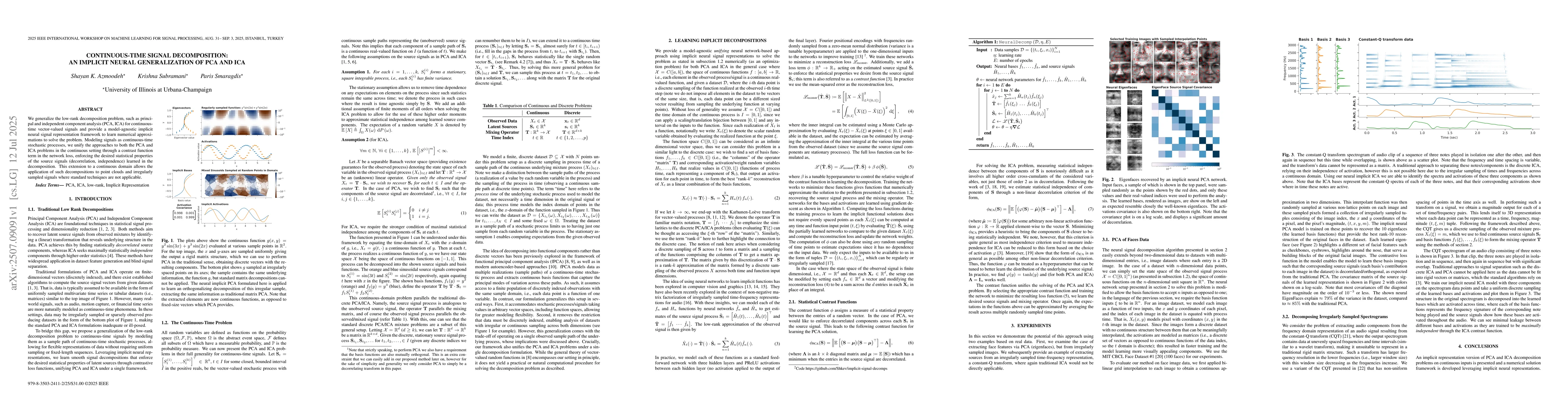 This research presents a novel framework that extends Principal Component Analysis (PCA) and Independent Component Analysis (ICA) to continuous-time signals, using an implicit neural model. It unifies PCA and ICA in a continuous domain, applicable to irregularly sampled signals like point clouds, by enforcing statistical properties via a contrast function in the network loss.
