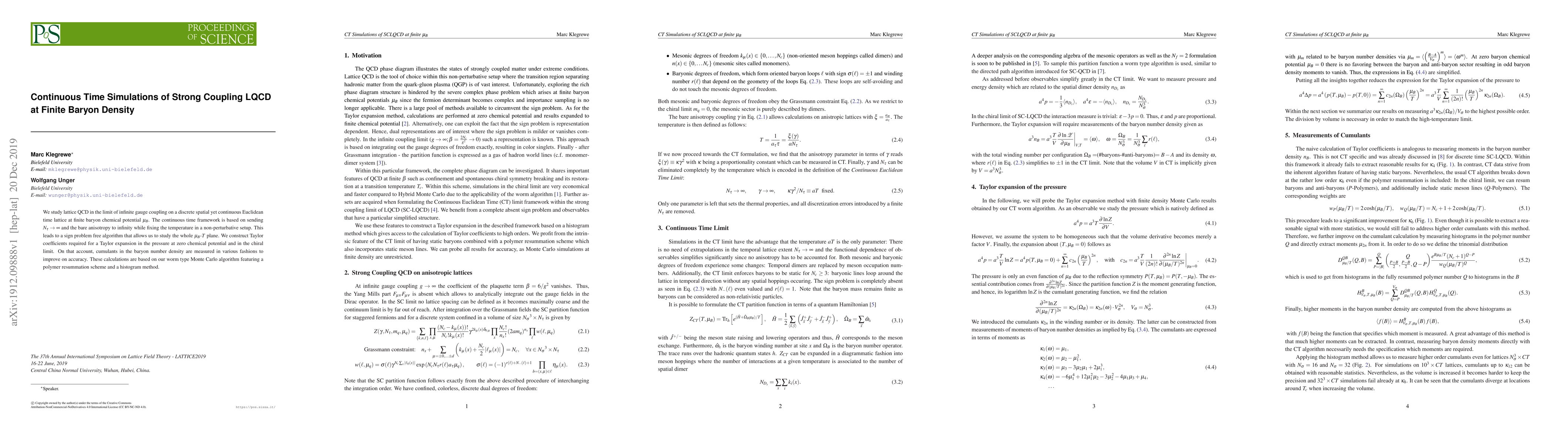 This research presents a continuous time simulation method for lattice QCD at infinite gauge coupling and finite baryon chemical potential, avoiding the sign problem. Using a non-perturbative setup, Taylor coefficients for pressure at zero chemical potential and chiral limit are constructed. Baryon number density cumulants are measured via a worm type Monte Carlo algorithm with polymer resummation and histogram methods, offering improved accuracy in understanding the QCD phase diagram at finite density.