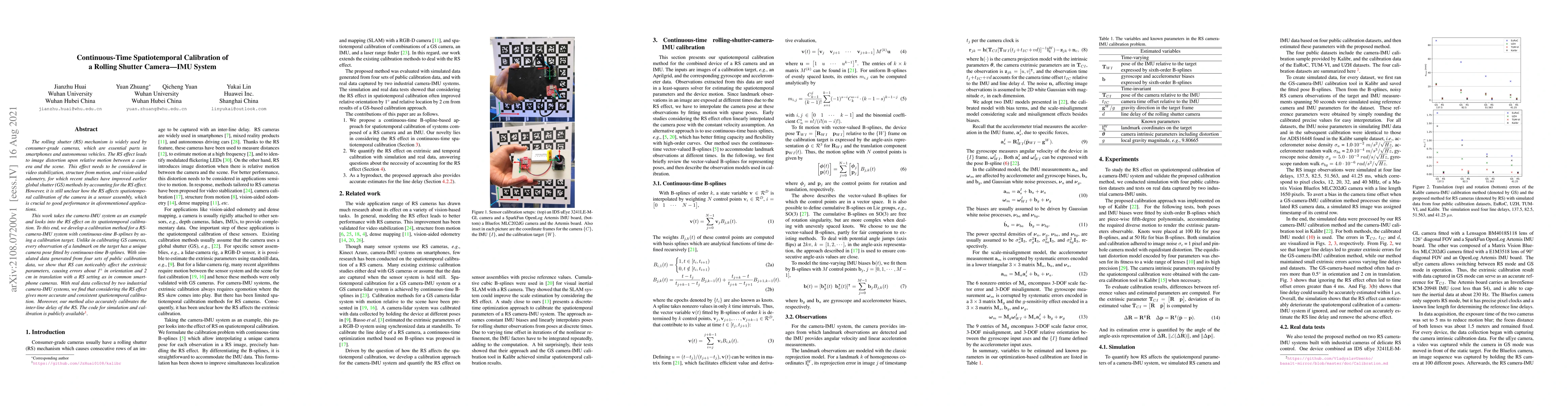 This paper develops a continuous-time B-spline method for calibrating rolling shutter (RS) camera-IMU systems, addressing the RS effect's impact on spatiotemporal calibration. The method shows improved accuracy and consistency in calibration, reducing errors by accounting for RS-induced distortions.