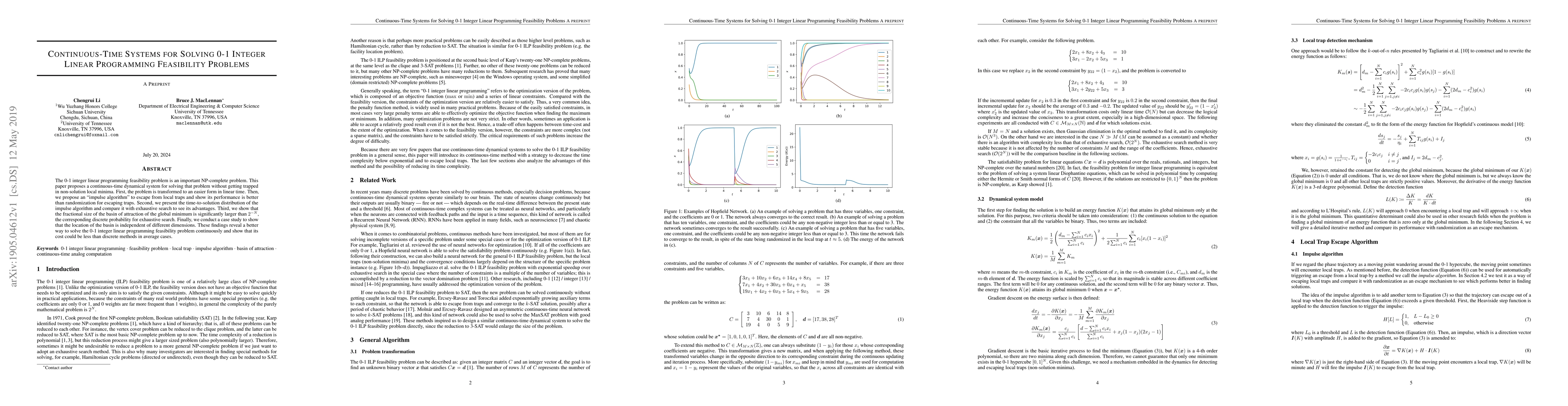 This paper proposes a continuous-time dynamical system to solve 0-1 integer linear programming feasibility problems, introducing an "impulse algorithm" to escape local minima. It demonstrates the algorithm's superior performance over randomization and shows that the continuous method's basin of attraction is significantly larger than that of exhaustive search.