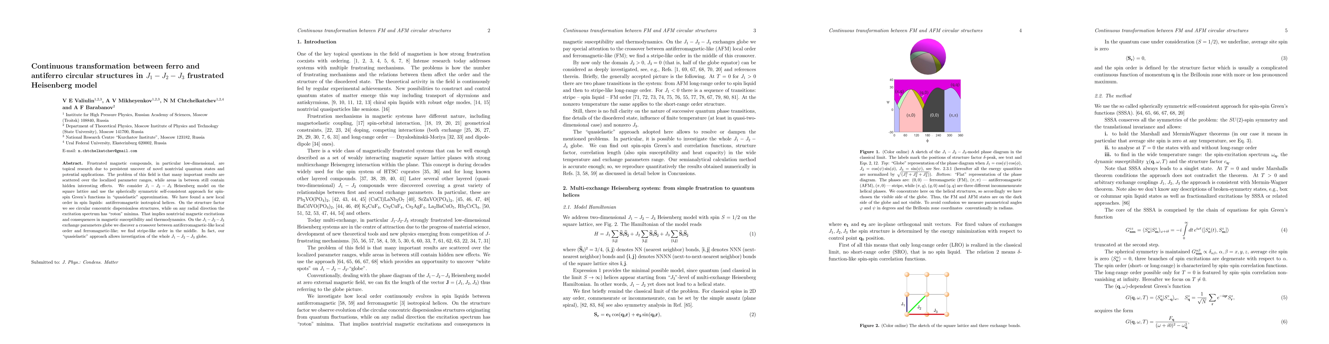 This paper investigates the $J_1-J_2-J_3$ Heisenberg model on a square lattice, revealing a continuous transformation between ferro and antiferro circular structures, including the emergence of antiferromagnetic isotropic helices and a "roton" minimum in the excitation spectrum. The study uncovers a crossover between antiferromagnetic and ferromagnetic orders across the parameter space.
