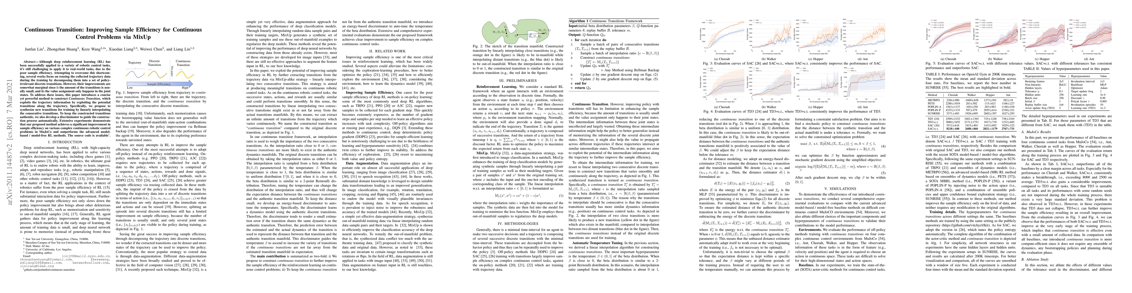 Although deep reinforcement learning (RL) has been successfully applied to a variety of robotic control tasks, it's still challenging to apply it to real-world tasks, due to the poor sample efficiency. Attempting to overcome this shortcoming, several works focus on reusing the collected trajectory data during the training by decomposing them into a set of policy-irrelevant discrete transitions. However, their improvements are somewhat marginal since i) the amount of the transitions is usually small, and ii) the value assignment only happens in the joint states. To address these issues, this paper introduces a concise yet powerful method to construct Continuous Transition, which exploits the trajectory information by exploiting the potential transitions along the trajectory. Specifically, we propose to synthesize new transitions for training by linearly interpolating the consecutive transitions. To keep the constructed transitions authentic, we also develop a discriminator to guide the construction process automatically. Extensive experiments demonstrate that our proposed method achieves a significant improvement in sample efficiency on various complex continuous robotic control problems in MuJoCo and outperforms the advanced model-based / model-free RL methods. The source code is available.