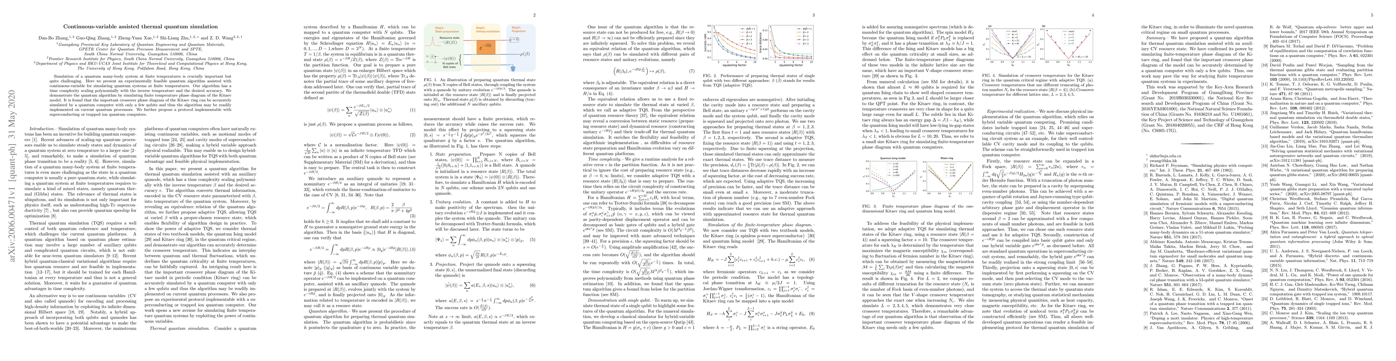 This paper introduces a continuous-variable assisted quantum algorithm for simulating quantum many-body systems at finite temperatures, demonstrating its application to the Kitaev model. The algorithm scales polynomially with inverse temperature and accuracy, showing feasibility on current quantum processors.
