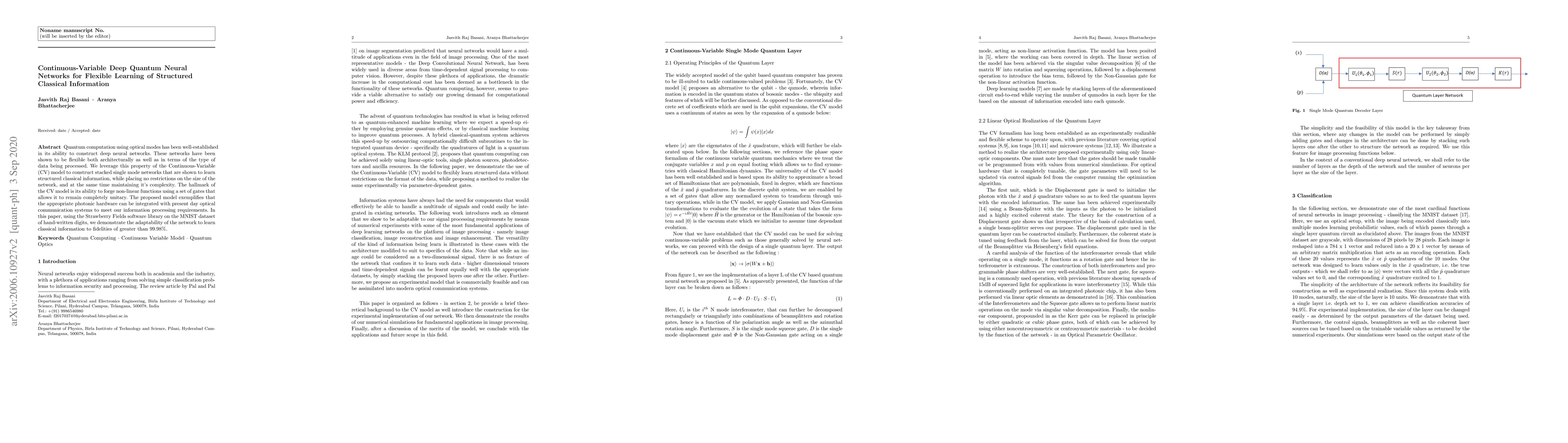 Quantum computation using optical modes has been well-established in its ability to construct deep neural networks. These networks have been shown to be flexible both architecturally as well as in terms of the type of data being processed. We leverage this property of the Continuous-Variable (CV) model to construct stacked single mode networks that are shown to learn structured classical information, while placing no restrictions on the size of the network, and at the same time maintaining it's complexity. The hallmark of the CV model is its ability to forge non-linear functions using a set of gates that allows it to remain completely unitary. The proposed model exemplifies that the appropriate photonic hardware can be integrated with present day optical communication systems to meet our information processing requirements. In this paper, using the Strawberry Fields software library on the MNIST dataset of hand-written digits, we demonstrate the adaptability of the network to learn classical information to fidelities of greater than 99.98%