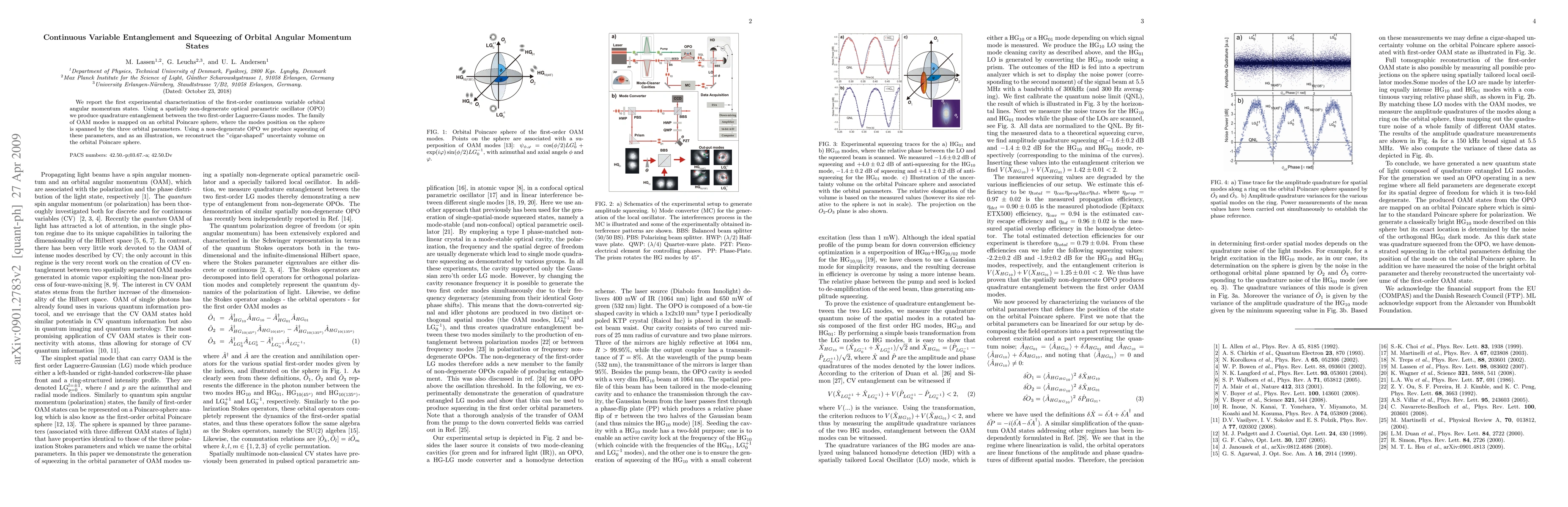 This study experimentally demonstrates quadrature entanglement and squeezing of first-order continuous variable orbital angular momentum (OAM) states using a non-degenerate optical parametric oscillator (OPO). The OAM modes are mapped onto an orbital Poincaré sphere, illustrating the uncertainty volume through reconstructed "cigar-shaped" distributions.