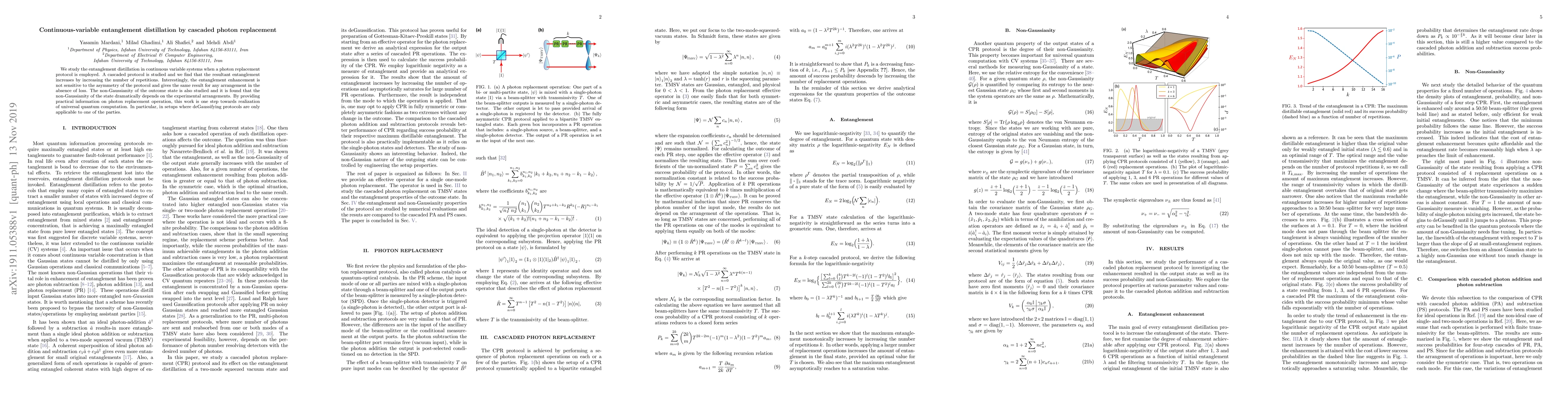 This paper investigates the continuous-variable entanglement distillation using a cascaded photon replacement protocol, finding that entanglement increases with more repetitions and remains unaffected by protocol asymmetry in the absence of loss. The study also highlights the significant dependence of the outcome state's non-Gaussianity on experimental setups, contributing to the realization of universal quantum computation.