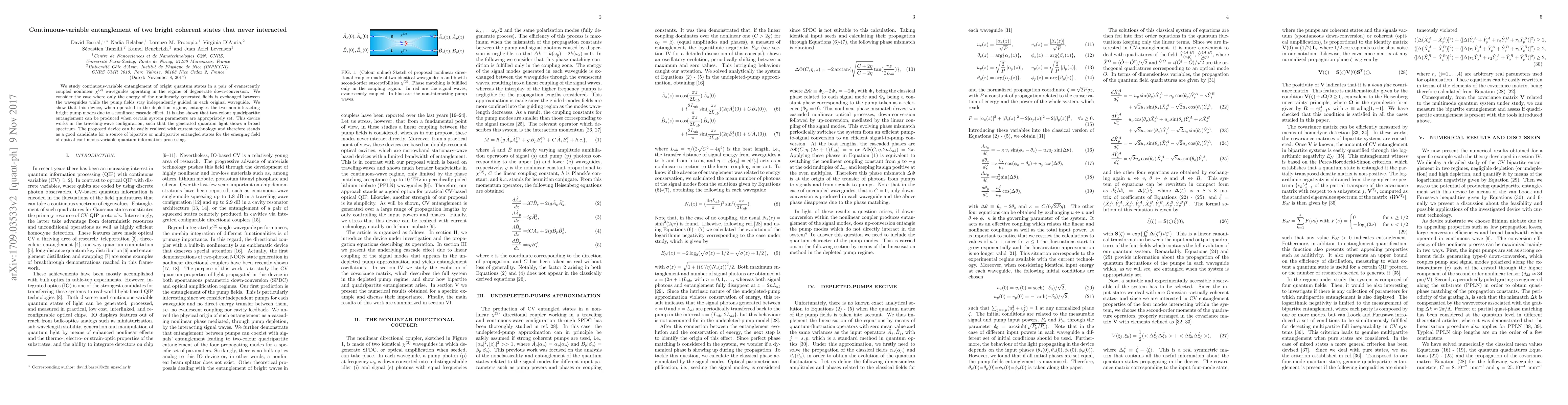 We study continuous-variable entanglement of bright quantum states in a pair of evanescently coupled nonlinear $\chi^{(2)}$ waveguides operating in the regime of degenerate down-conversion. We consider the case where only the energy of the nonlinearly generated fields is exchanged between the waveguides while the pump fields stay independently guided in each original waveguide. We show that this device, when operated in the depletion regime, entangles the two non-interacting bright pump modes due to a nonlinear cascade effect. It is also shown that two-colour quadripartite entanglement can be produced when certain system parameters are appropriately set. This device works in the traveling-wave configuration, such that the generated quantum light shows a broad spectrum. The proposed device can be easily realized with current technology and therefore stands as a good candidate for a source of bipartite or multipartite entangled states for the emerging field of optical continuous-variable quantum information processing.