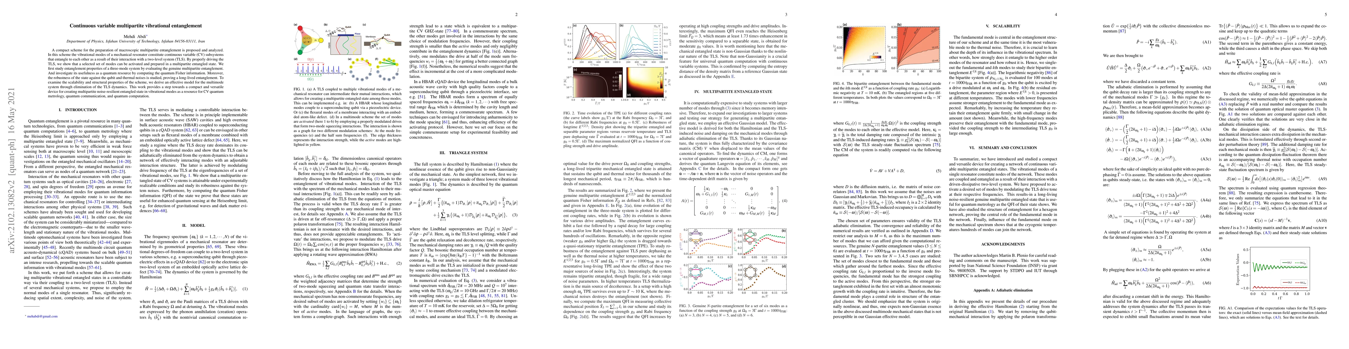 This paper proposes a scheme for generating macroscopic multipartite entanglement in continuous variable subsystems using the vibrational modes of a mechanical resonator. The study demonstrates the preparation of entangled states via interaction with a two-level system, evaluates genuine multipartite entanglement, and assesses the robustness against noise, highlighting potential applications in quantum metrology, communication, and computation.
