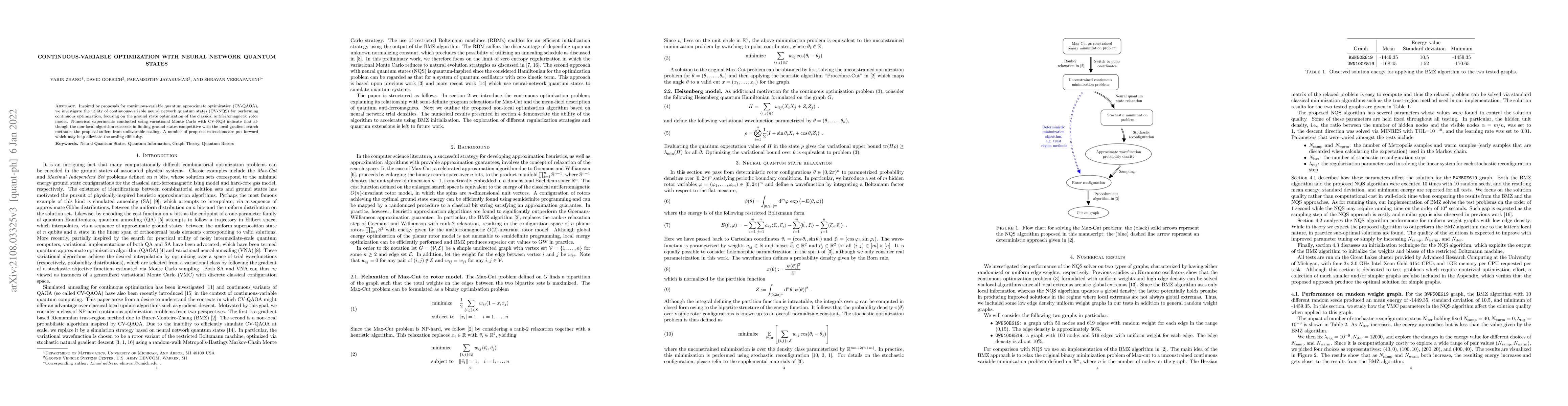 This paper explores continuous-variable neural network quantum states (CV-NQS) for continuous optimization, demonstrating their effectiveness in ground state optimization of the classical antiferromagnetic rotor model. Despite competitive results, the method shows unfavorable scaling, prompting suggestions for potential improvements.