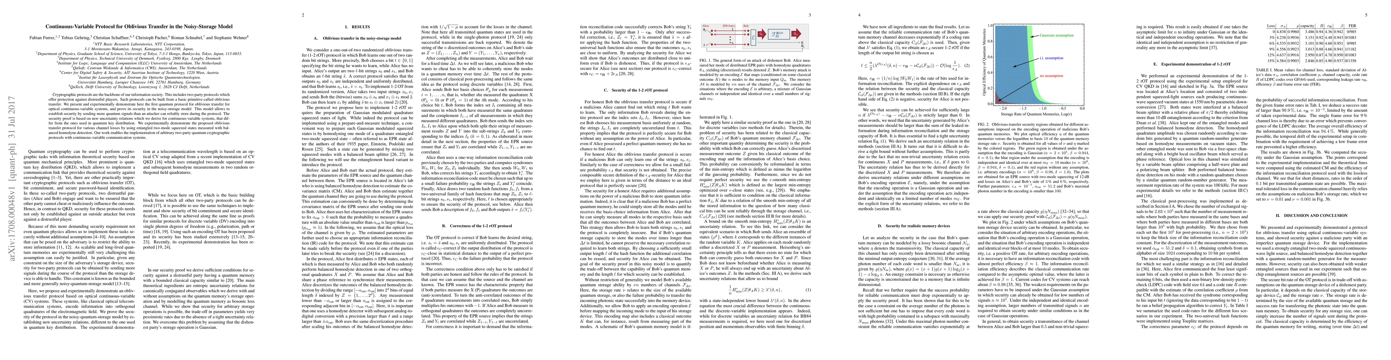 This paper presents a quantum protocol for continuous-variable oblivious transfer, demonstrating its security in the noisy-storage model using new uncertainty relations. Experimentally validated using entangled states, it enables secure two-party quantum cryptographic protocols in continuous-variable systems.