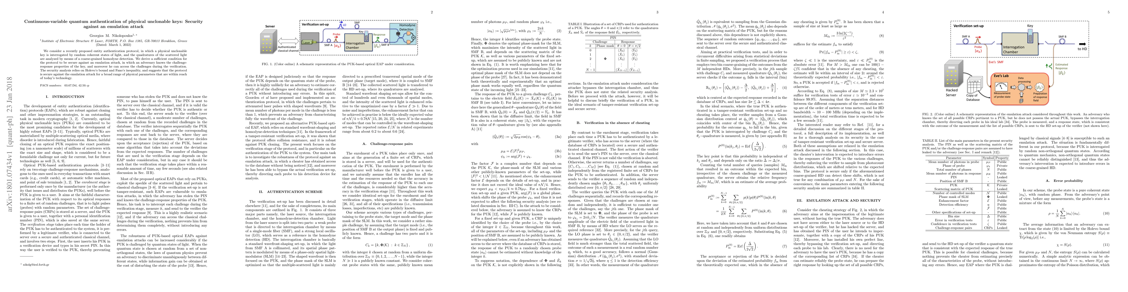 This paper proposes a quantum authentication protocol using physical unclonable keys interrogated by random coherent states, ensuring security against emulation attacks through analysis of scattered light quadratures. The protocol's security is validated using Holevo's bound and Fano's inequality, indicating it is secure for many technologically feasible parameters.