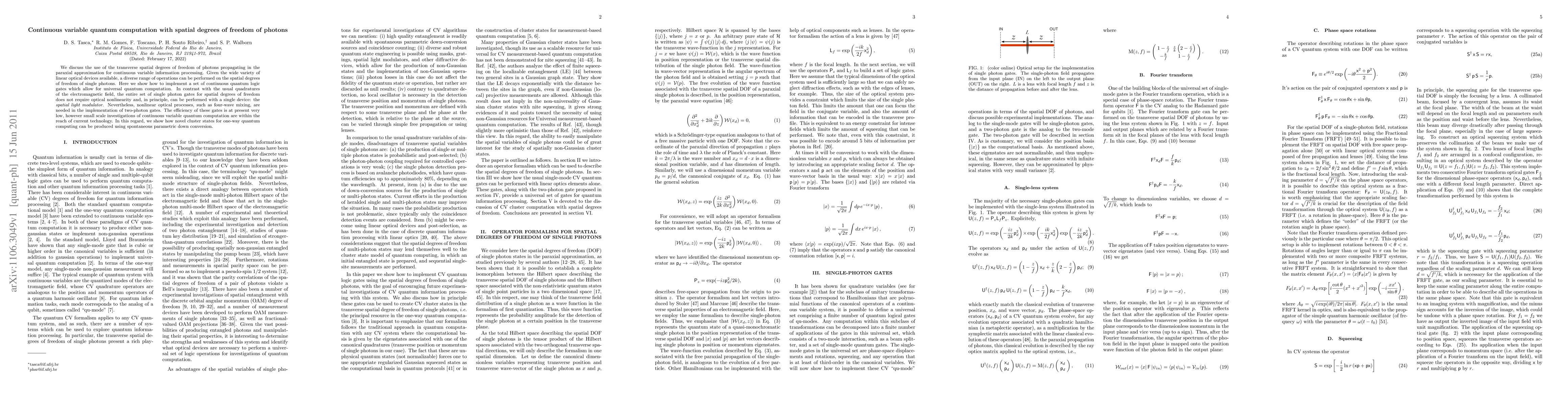 This paper explores continuous variable quantum computation using the spatial degrees of freedom of photons, demonstrating a set of quantum logic gates that can be implemented without optical nonlinearity. While current efficiency is low, the potential for scalable quantum computation using spatial light modulators and spontaneous parametric down conversion is highlighted.