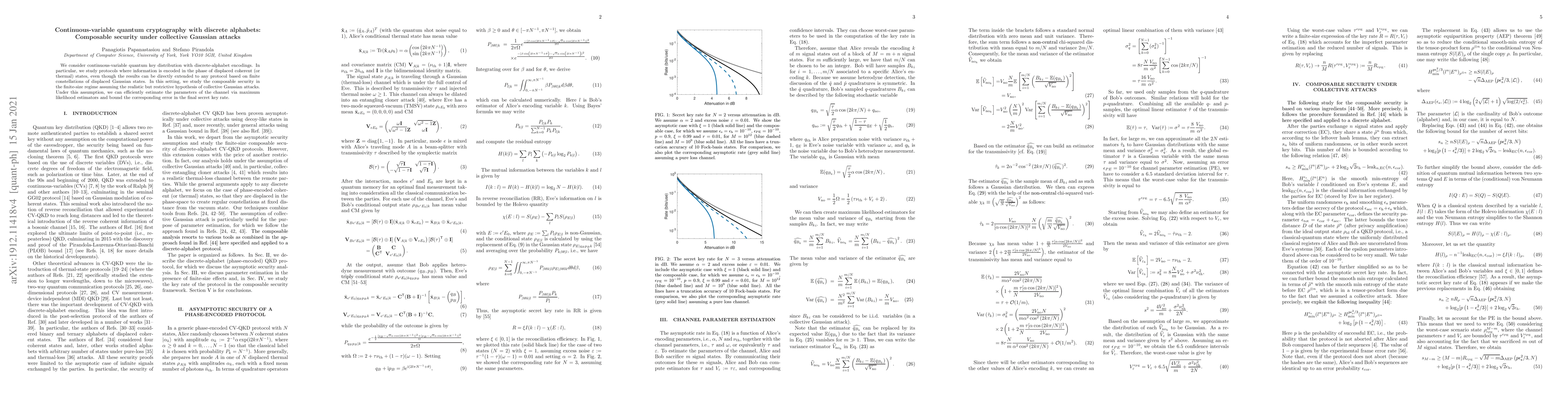 This paper investigates continuous-variable quantum key distribution protocols using discrete-alphabet encodings, focusing on phase-encoded displaced coherent states. It provides a composable security analysis under collective Gaussian attacks, estimating channel parameters and bounding the error in the secret key rate.