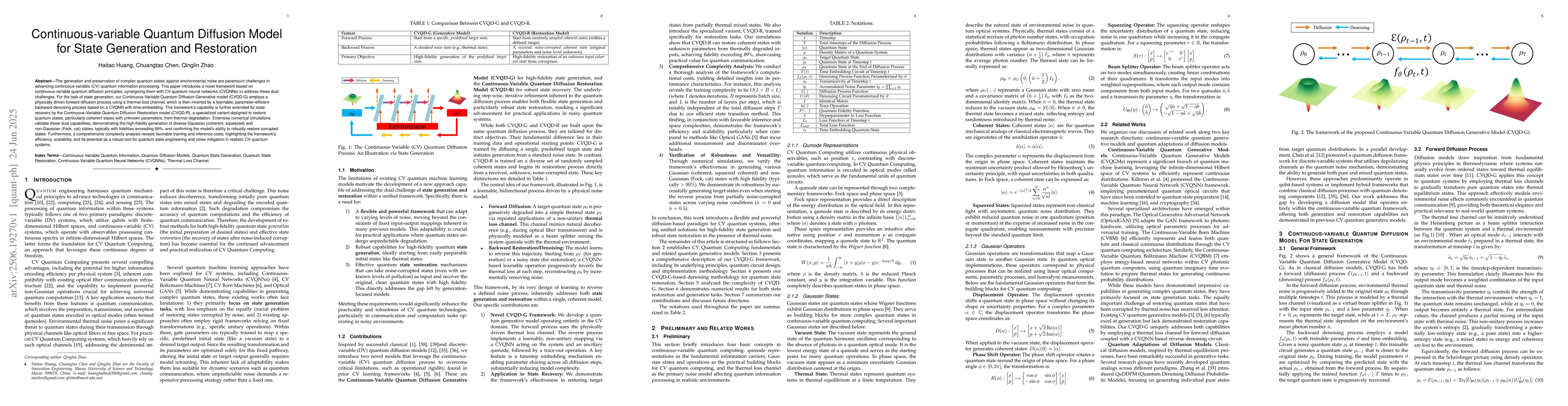 The generation and preservation of complex quantum states against environmental noise are paramount challenges in advancing continuous-variable (CV) quantum information processing. This paper introduces a novel framework based on continuous-variable quantum diffusion principles, synergizing them with CV quantum neural networks (CVQNNs) to address these dual challenges. For the task of state generation, our Continuous-Variable Quantum Diffusion Generative model (CVQD-G) employs a physically driven forward diffusion process using a thermal loss channel, which is then inverted by a learnable, parameter-efficient backward denoising process based on a CVQNN with time-embedding. This framework's capability is further extended for state recovery by the Continuous-Variable Quantum Diffusion Restoration model (CVQD-R), a specialized variant designed to restore quantum states, particularly coherent states with unknown parameters, from thermal degradation. Extensive numerical simulations validate these dual capabilities, demonstrating the high-fidelity generation of diverse Gaussian (coherent, squeezed) and non-Gaussian (Fock, cat) states, typically with fidelities exceeding 99%, and confirming the model's ability to robustly restore corrupted states. Furthermore, a comprehensive complexity analysis reveals favorable training and inference costs, highlighting the framework's efficiency, scalability, and its potential as a robust tool for quantum state engineering and noise mitigation in realistic CV quantum systems.