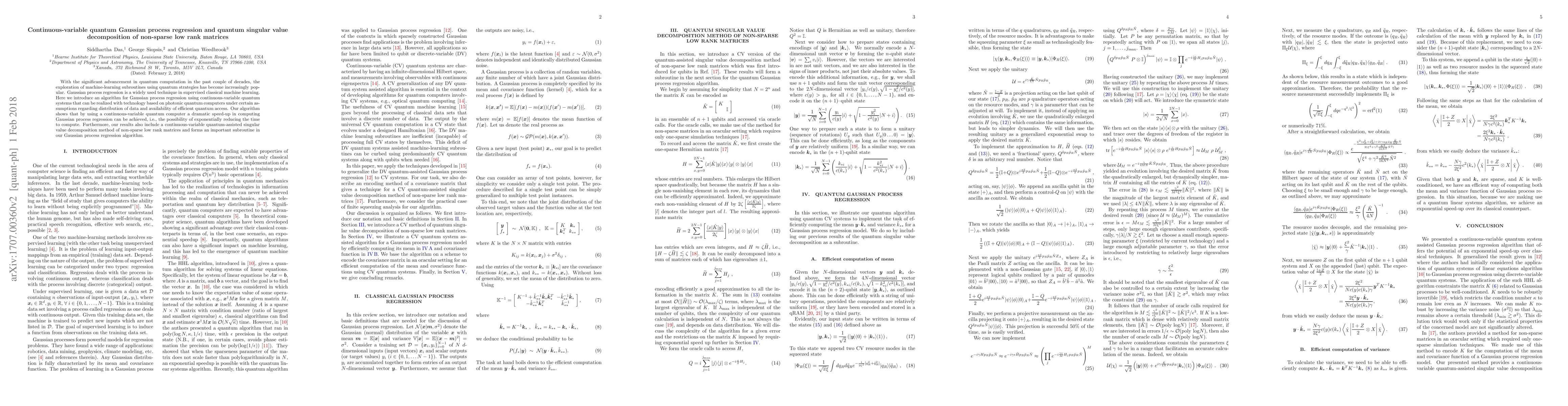 This paper proposes a quantum-enhanced algorithm for Gaussian process regression using continuous-variable quantum systems, potentially achieving exponential speed-up over classical methods. It also introduces a quantum-assisted singular value decomposition method for non-sparse low rank matrices, which is a key component of the proposed regression algorithm.