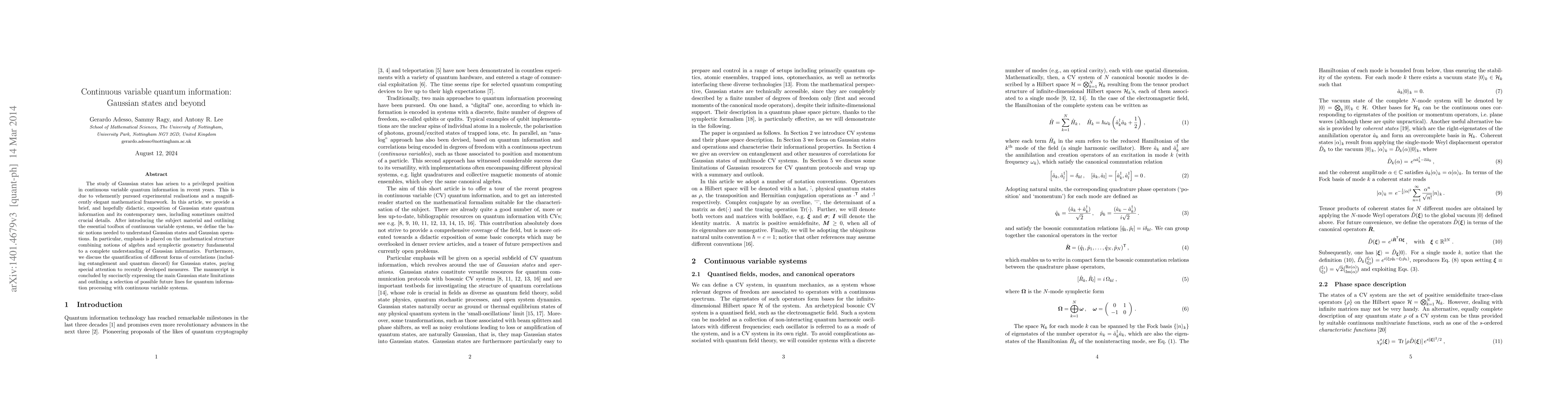 This paper offers an accessible overview of Gaussian states in continuous variable quantum information, highlighting their elegant mathematical framework and experimental significance. It covers essential tools, definitions, and measures of correlations, and discusses future directions for quantum information processing with these systems.