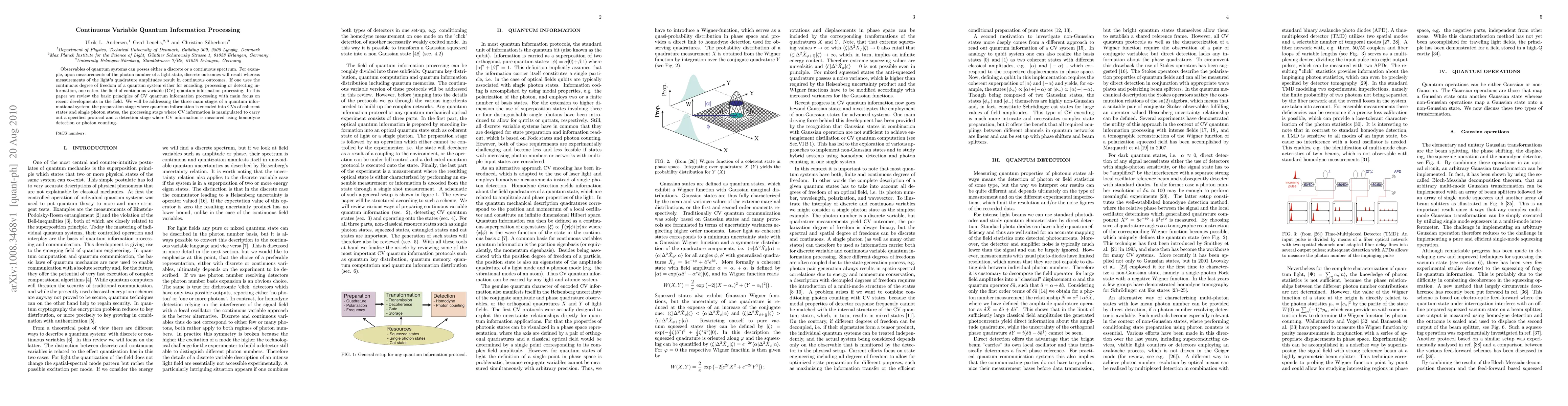 This paper reviews the principles of continuous variable (CV) quantum information processing, focusing on recent developments. It covers the preparation, processing, and detection of CV information using coherent and single photon states, and discusses homodyne detection and photon counting techniques.