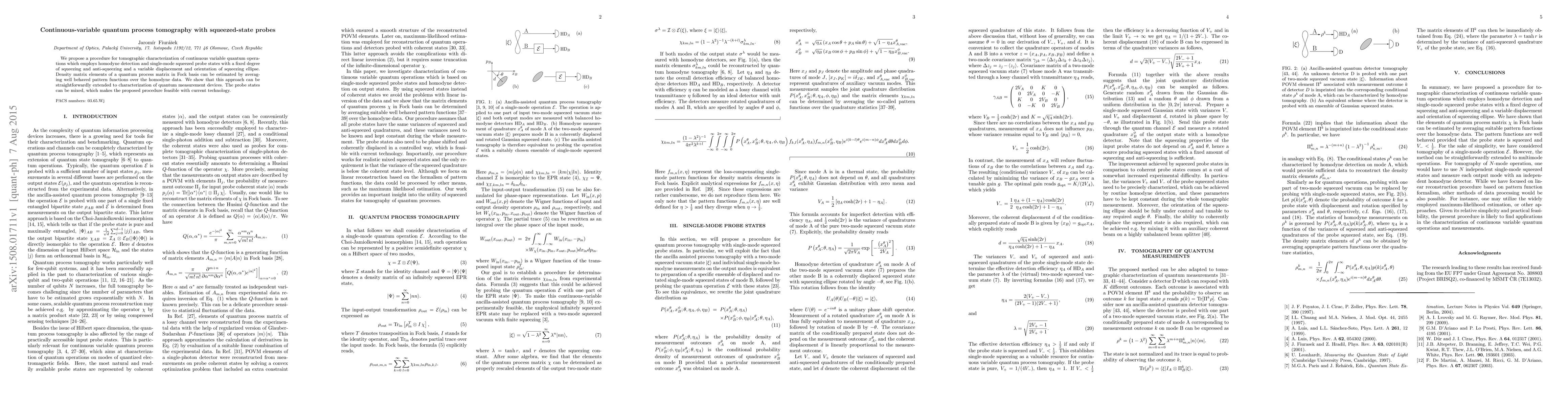 This paper proposes a method for continuous-variable quantum process tomography using squeezed-state probes, employing homodyne detection and mixed probe states. The approach estimates the quantum process matrix by averaging pattern functions over homodyne data, extending to characterization of quantum measurement devices.