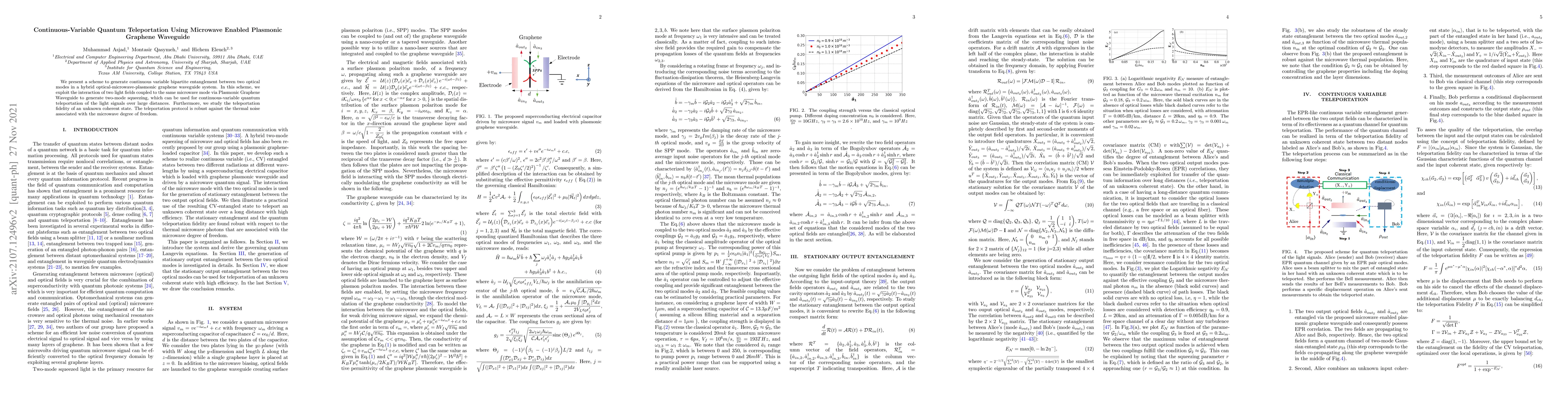 This research proposes a hybrid optical-microwave-plasmonic graphene waveguide system to generate continuous variable bipartite entanglement, enabling continuous-variable quantum teleportation. The scheme leverages two-mode squeezing for robust teleportation of light signals over long distances, maintaining fidelity despite thermal noise.