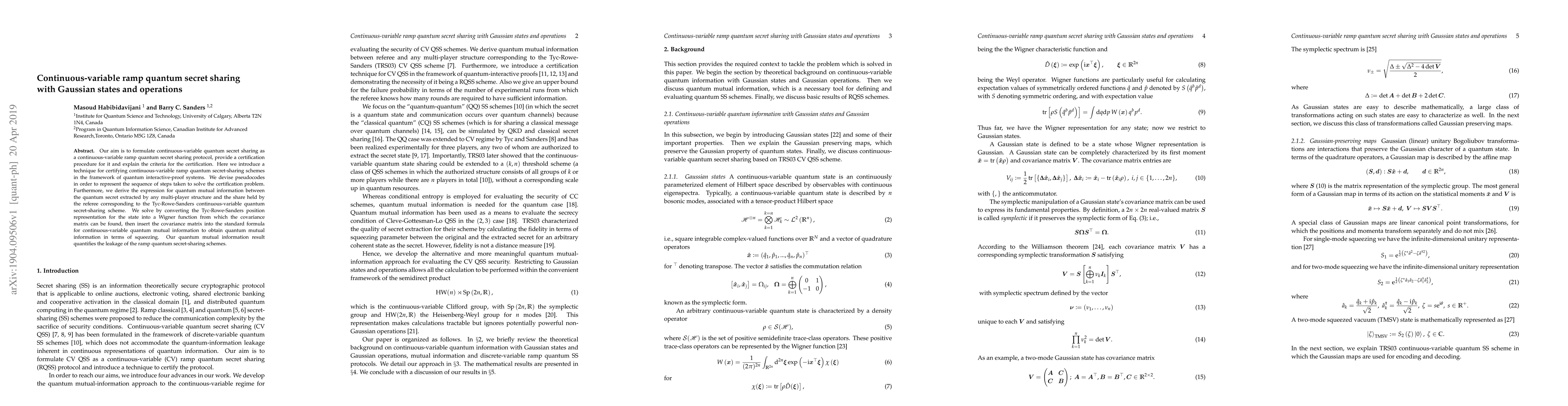 This paper formulates continuous-variable quantum secret sharing as a ramp protocol, providing a certification procedure and criteria for it. It derives quantum mutual information to quantify the leakage in the Tyc-Rowe-Sanders scheme, using the Wigner function to convert the position representation into a covariance matrix for the calculation.