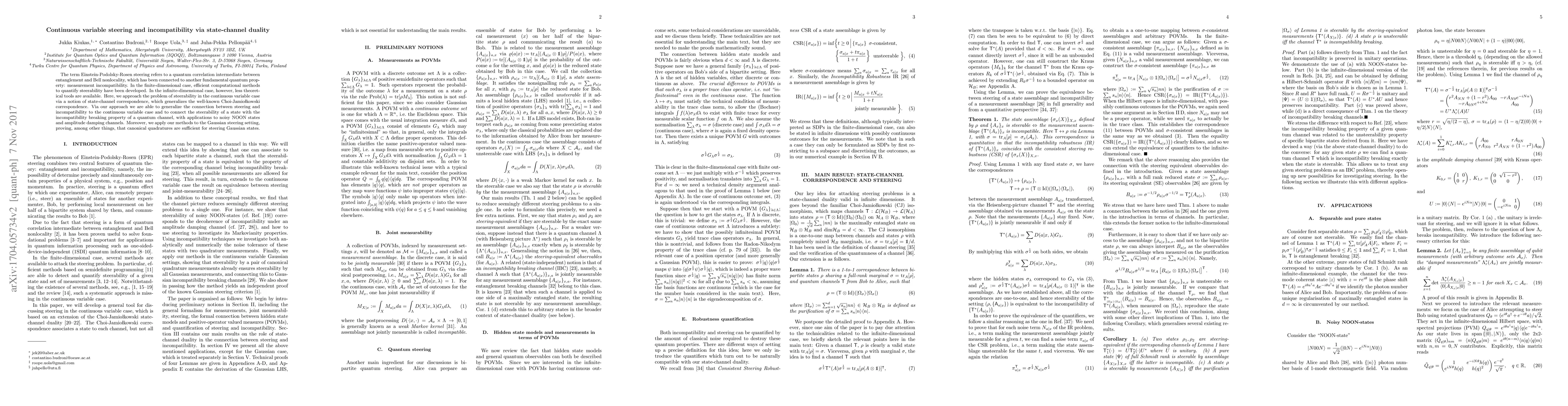 This paper develops a method to quantify steering in continuous variable quantum systems using a state-channel duality, extending the connection between quantum steering and measurement incompatibility to infinite dimensions. It proves that canonical quadratures are sufficient for steering Gaussian states.
