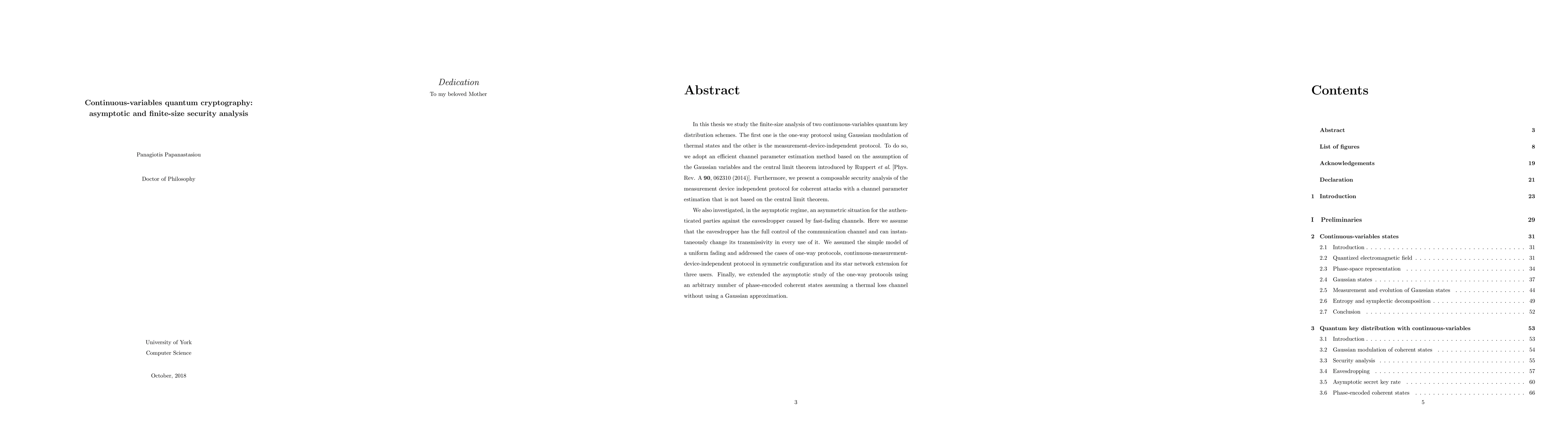 In this thesis we study the finite-size analysis of two continuous-variables quantum key distribution schemes. The first one is the one-way protocol using Gaussian modulation of thermal states and the other is the measurement-device-independent protocol. To do so, we adopt an efficient channel parameter estimation method based on the assumption of the Gaussian variables and the central limit theorem introduced by Ruppert et al. [Phys. Rev. A 90, 062310 (2014)]. Furthermore, we present a composable security analysis of the measurement device independent protocol for coherent attacks with a channel parameter estimation that is not based on the central limit theorem. We also investigated, in the asymptotic regime, an asymmetric situation for the authenticated parties against the eavesdropper caused by fast-fading channels. Here we assume that the eavesdropper has the full control of the communication channel and can instantaneously change its transmissivity in every use of it. We assumed the simple model of a uniform fading and addressed the cases of one-way protocols, continuous-measurement device-independent protocol in symmetric configuration and its star network extension for three users. Finally, we extended the asymptotic study of the one-way protocols using an arbitrary number of phase-encoded coherent states assuming a thermal loss channel without using a Gaussian approximation.