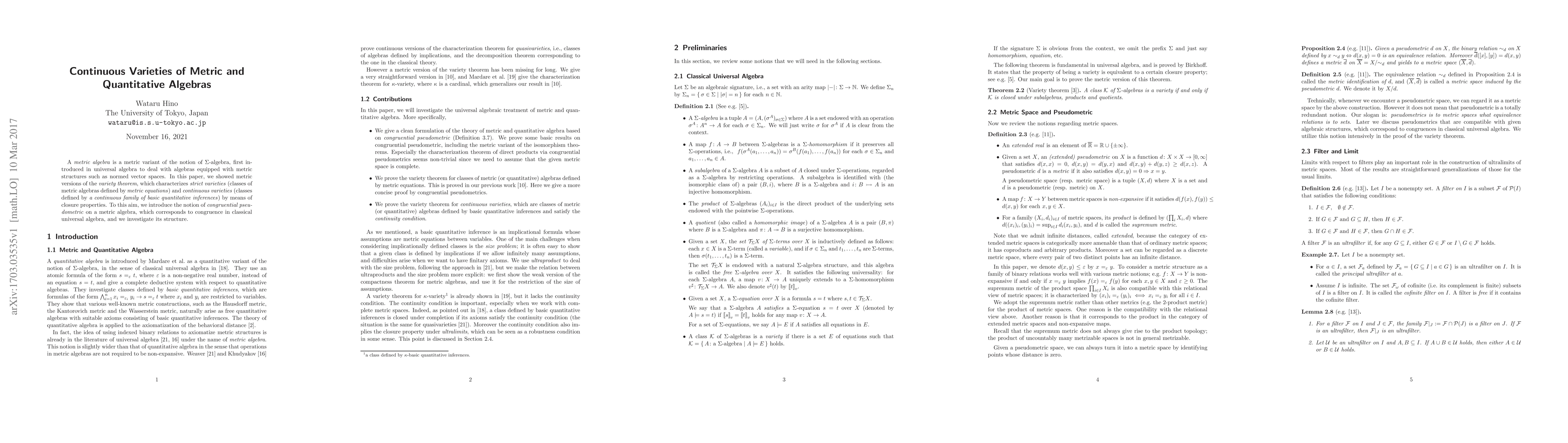 This paper presents metric versions of the variety theorem for metric algebras, characterizing strict and continuous varieties through closure properties, and introduces congruential pseudometrics to study the structure corresponding to congruence in universal algebra.